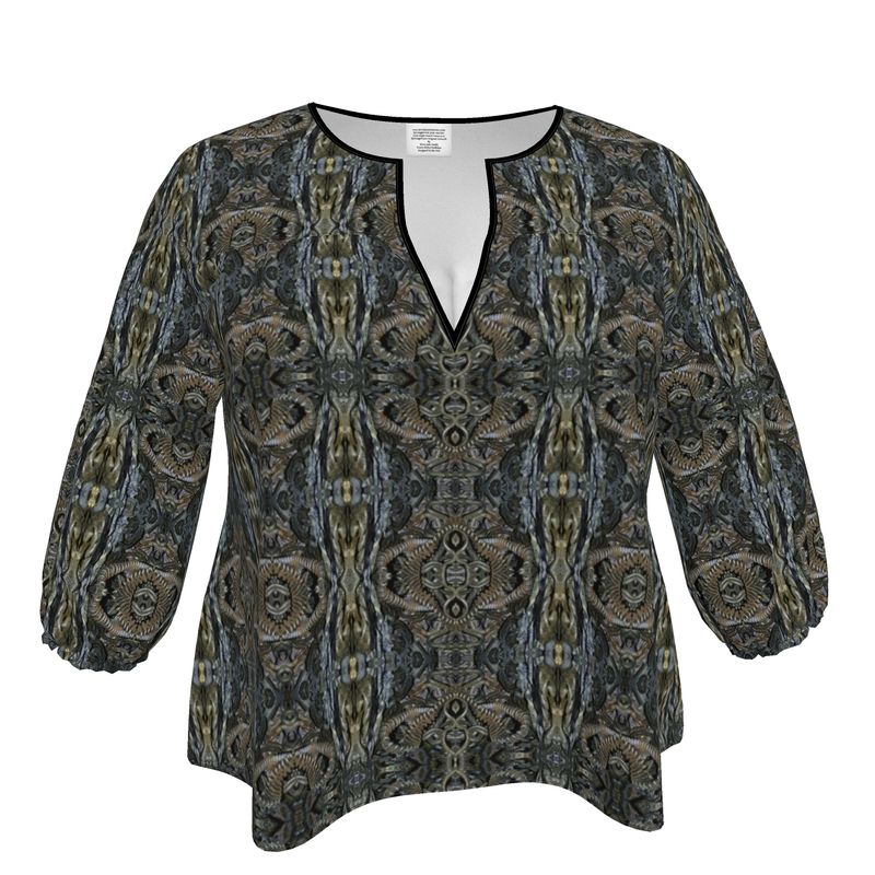 Description: The blouse, featuring original art by River Jade Smith Travis "Doby" Huffaker, is a testament to sustainable fashion. Using water-based inks for printing, it champions eco-friendliness, eliminating harmful chemicals. Crafted in a single facility, it reduces environmental impact, aligning perfectly with the eco-conscious values of its wearers.