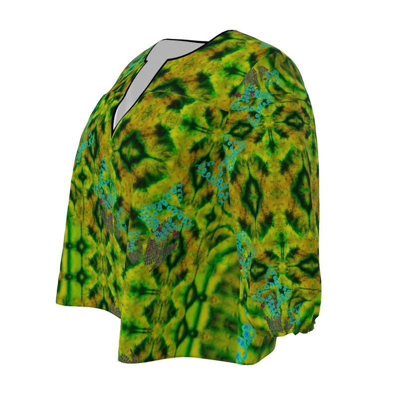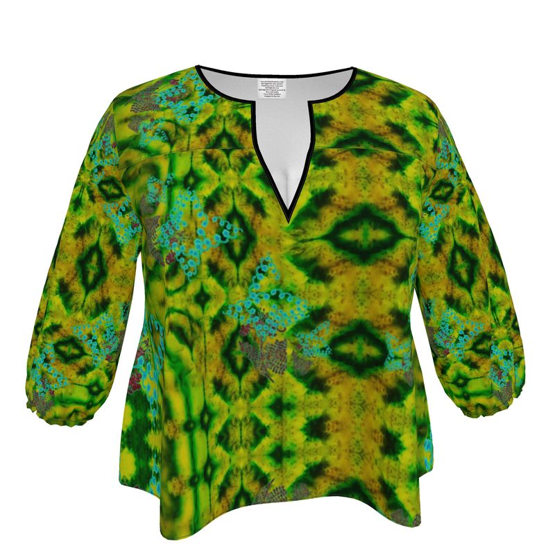 Description: The blouse, featuring original art by River Jade Smith Travis "Doby" Huffaker, is a testament to sustainable fashion. Using water-based inks for printing, it champions eco-friendliness, eliminating harmful chemicals. Crafted in a single facility, it reduces environmental impact, aligning perfectly with the eco-conscious values of its wearers.
