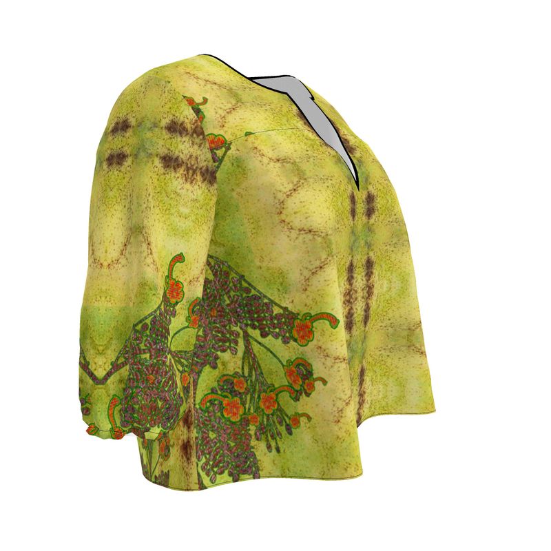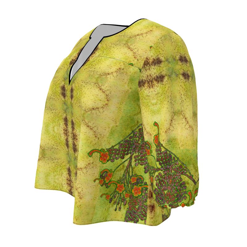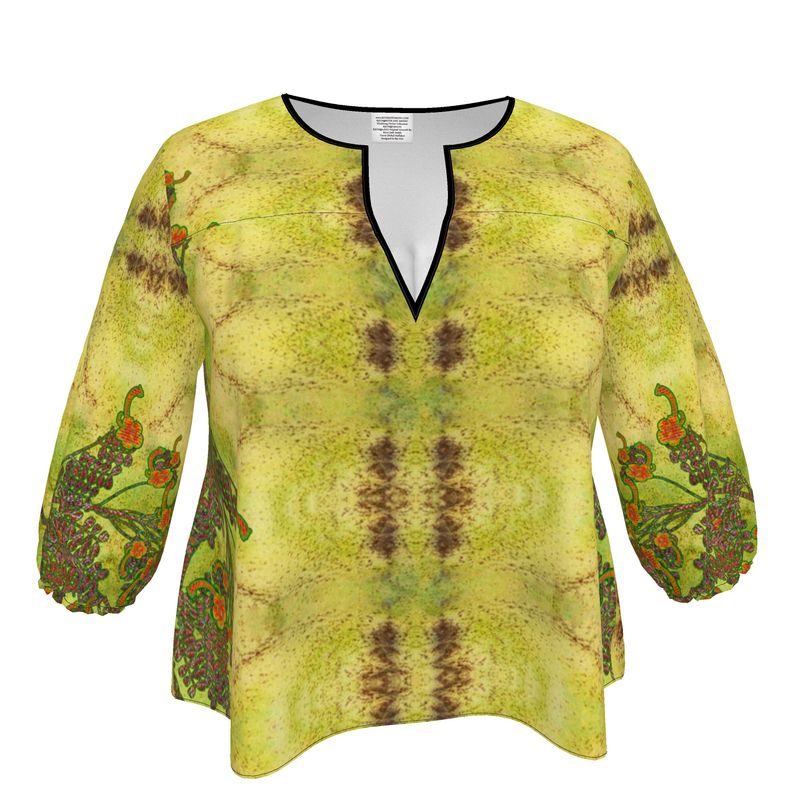 Description: The blouse, featuring original art by River Jade Smith Travis "Doby" Huffaker, is a testament to sustainable fashion. Using water-based inks for printing, it champions eco-friendliness, eliminating harmful chemicals. Crafted in a single facility, it reduces environmental impact, aligning perfectly with the eco-conscious values of its wearers.