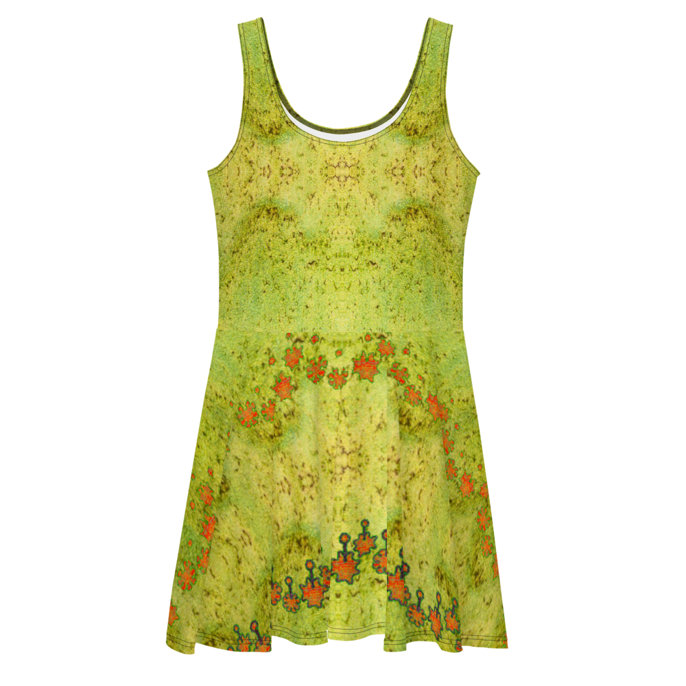 Crafted from soft, elastic fabric that feels like a second skin, this sleeveless skater dress combines comfort with visual impact. Featuring custom, all-over prints inspired by the original artwork of RJSTH, each dress is a wearable masterpiece. The flared, mid-thigh skirt creates an enchanting twirl, while the elastic waistline ensures a perfect fit for every body type.