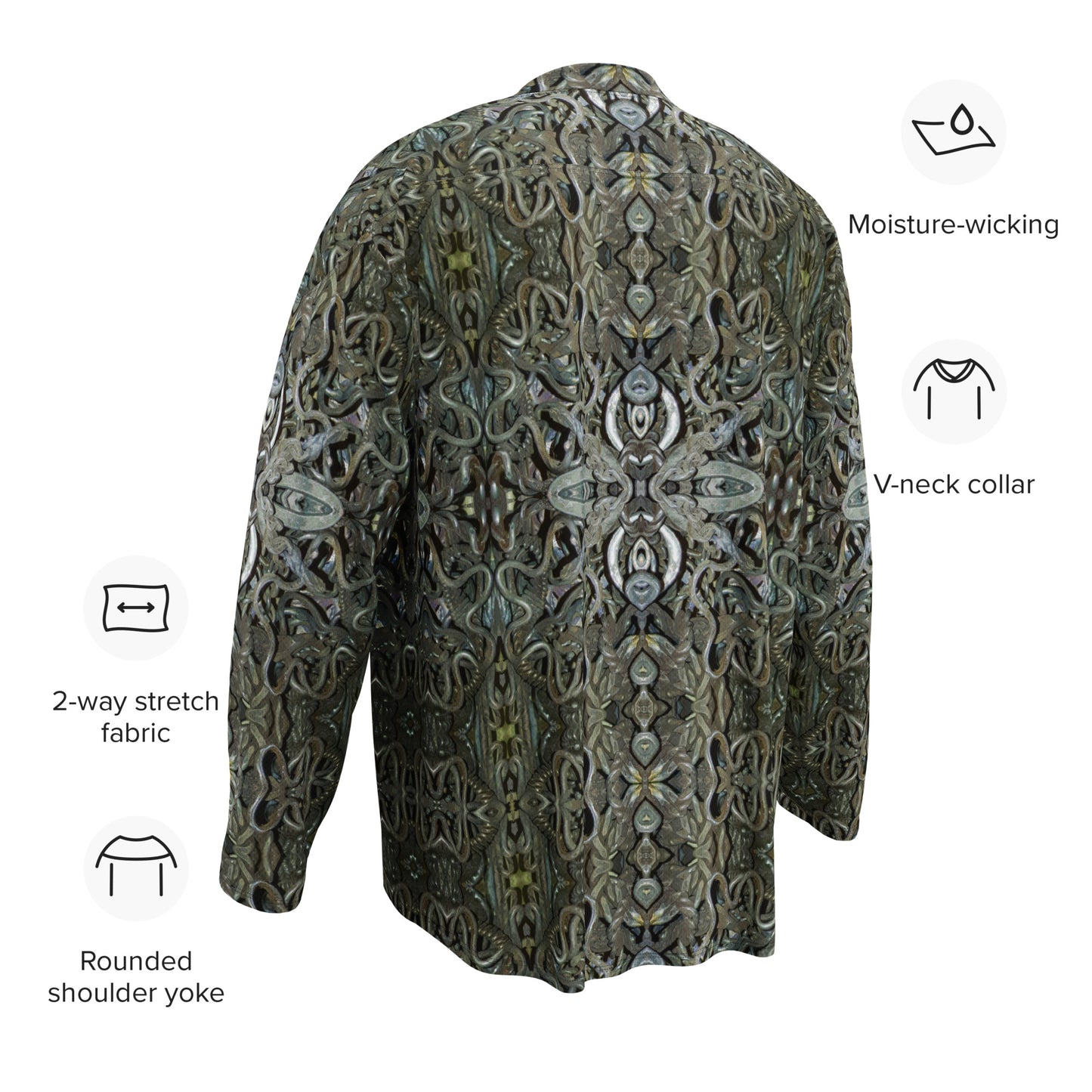Hockey jerseys trace their origins to the late 19th century, crafted from heavy wool to keep players warm in the frigid rinks of early ice hockey. Over time, materials evolved for better performance, breathability, and durability. River Jade Smithy’s take on this classic sportswear reinvents it as a canvas of wearable art, incorporating Ancient Now art techniques of the Grail Smith into every fiber. By integrating sublimation printing, this jersey transcends mere apparel, showcasing luminous patterns that remain vibrant over time—just like the legends that inspire them.