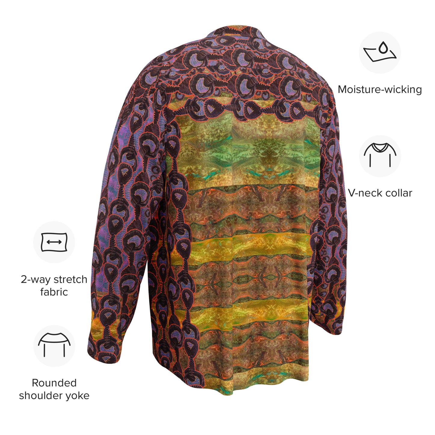 Hockey jerseys trace their origins to the late 19th century, crafted from heavy wool to keep players warm in the frigid rinks of early ice hockey. Over time, materials evolved for better performance, breathability, and durability. River Jade Smithy’s take on this classic sportswear reinvents it as a canvas of wearable art, incorporating Ancient Now art techniques of the Grail Smith into every fiber. By integrating sublimation printing, this jersey transcends mere apparel, showcasing luminous patterns that remain vibrant over time—just like the legends that inspire them.