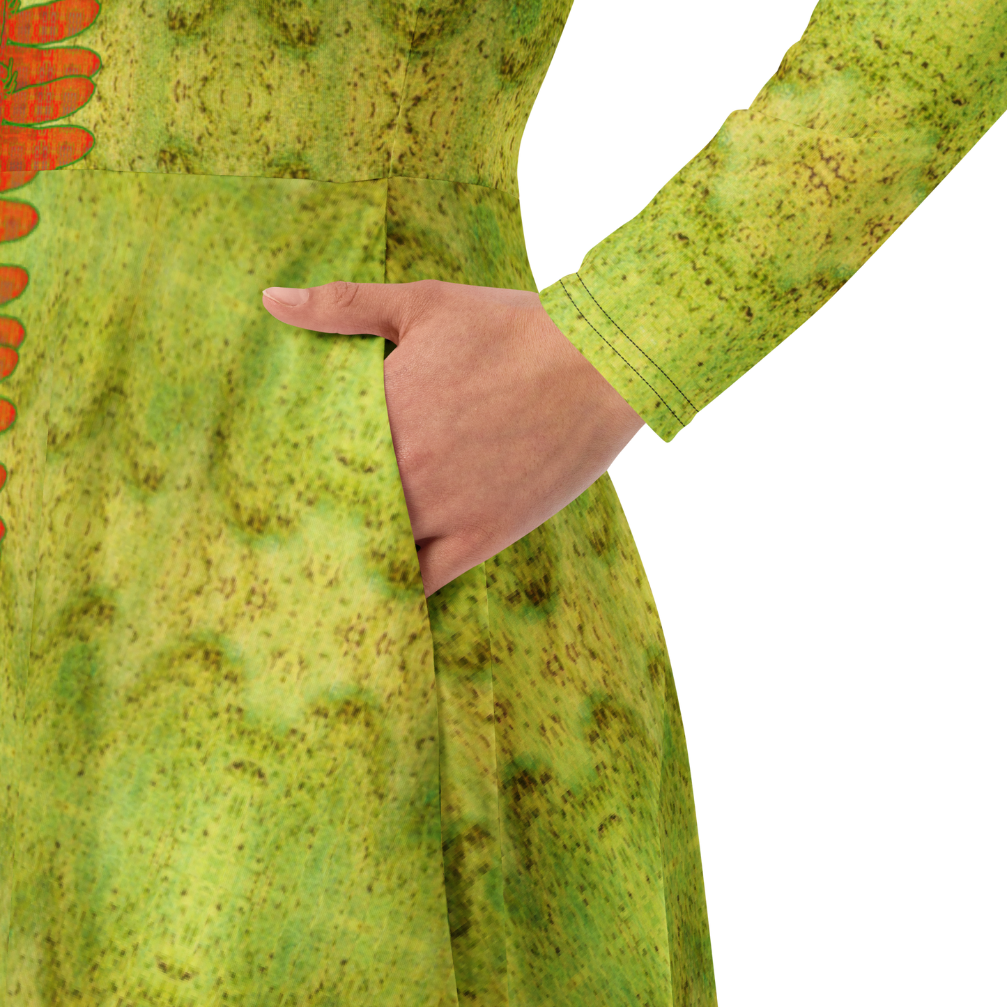 Meticulously crafted in premium knit mid-weight jersey, this midi-length dress offers timeless versatility. The fitted waist and flared bottom part create a flattering shape, while long sleeves and a classic boat neckline add sophistication. Side pockets give practicality, elevating the dress into an everyday essential that can shift effortlessly from casual to formal. Printed with exclusive artwork from River Jade Smith Travis Huffaker, each piece is unique—an investment in wearable art.
