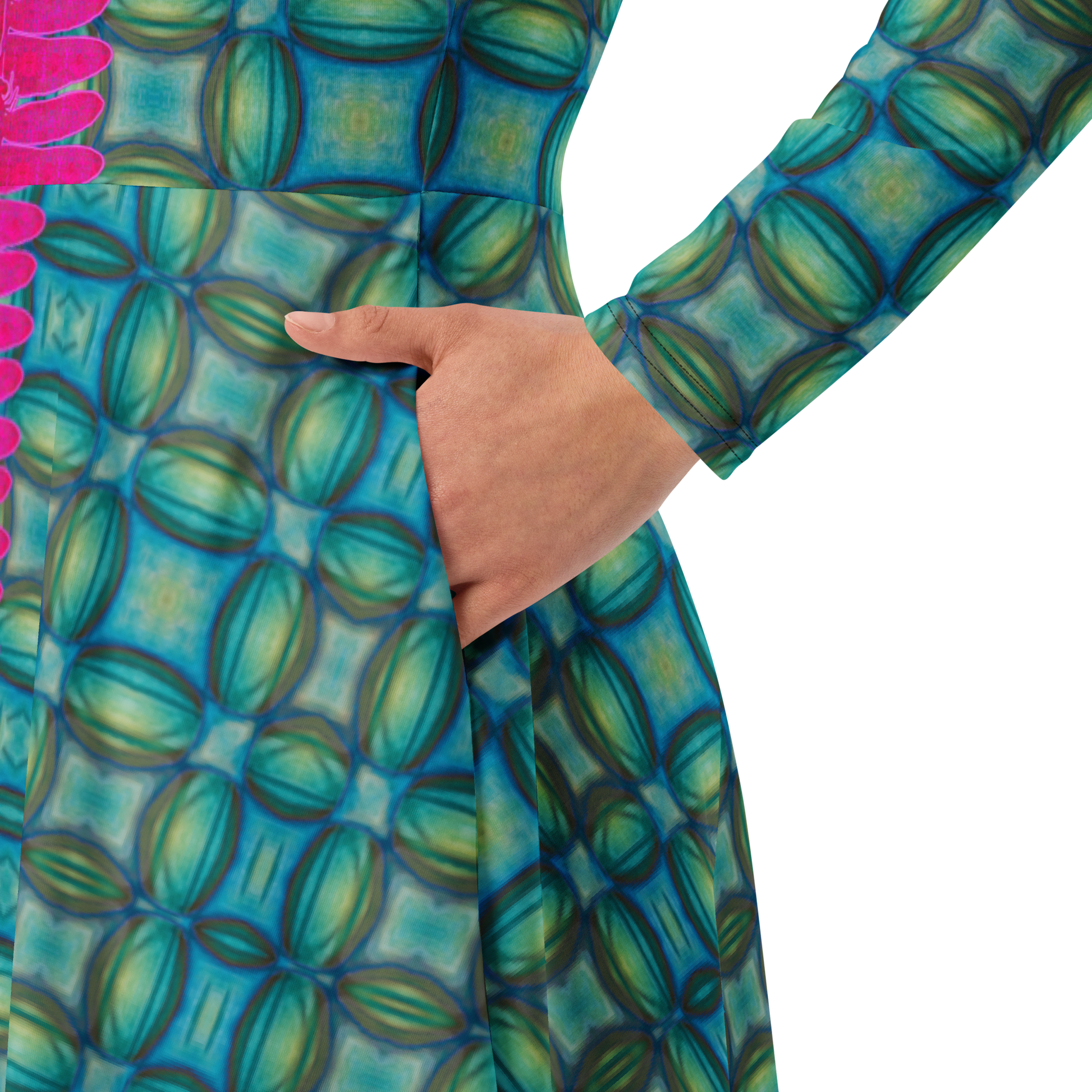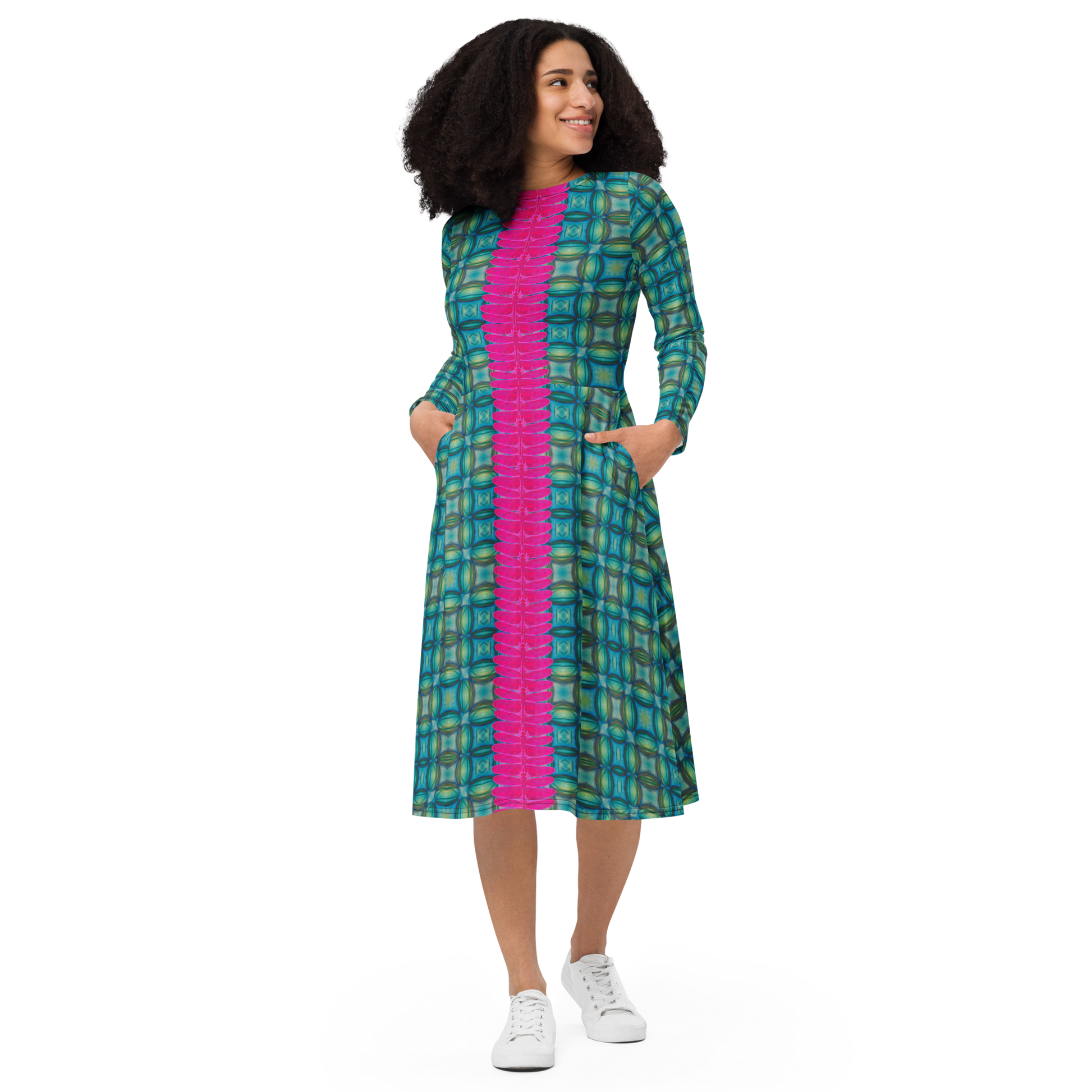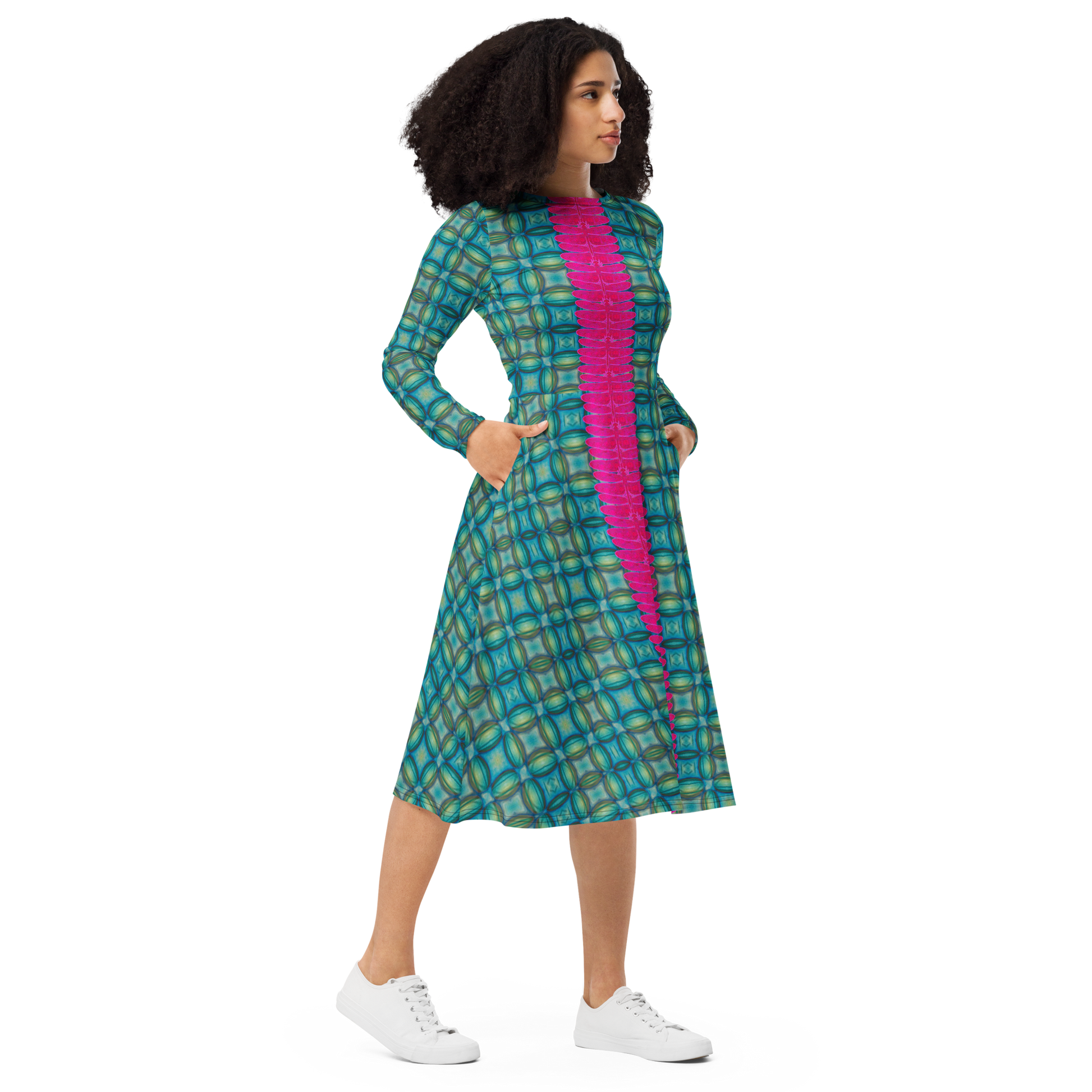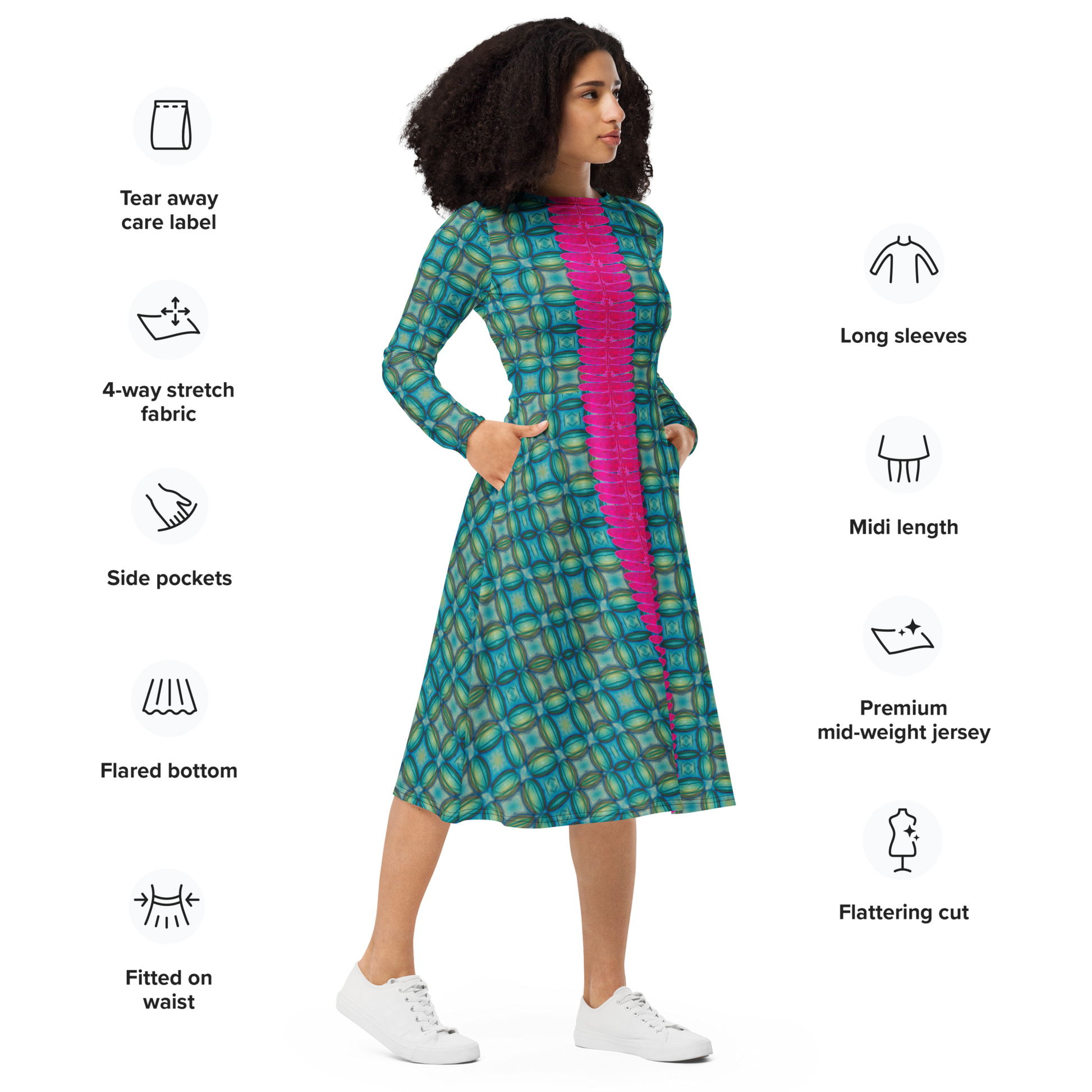 Meticulously crafted in premium knit mid-weight jersey, this midi-length dress offers timeless versatility. The fitted waist and flared bottom part create a flattering shape, while long sleeves and a classic boat neckline add sophistication. Side pockets give practicality, elevating the dress into an everyday essential that can shift effortlessly from casual to formal. Printed with exclusive artwork from River Jade Smith Travis Huffaker, each piece is unique—an investment in wearable art.