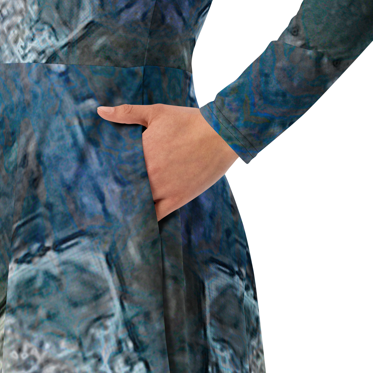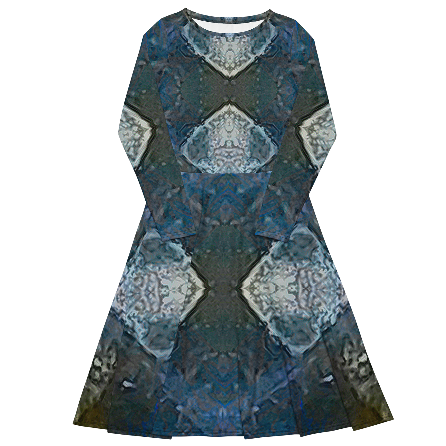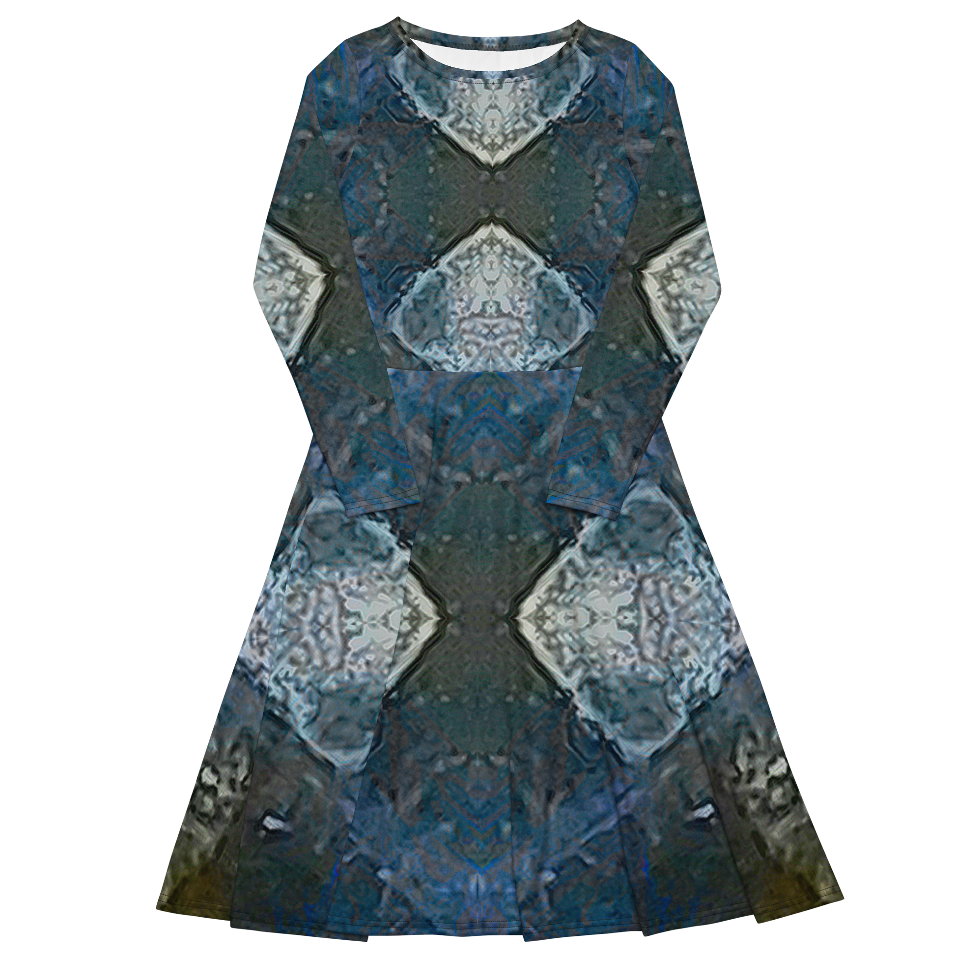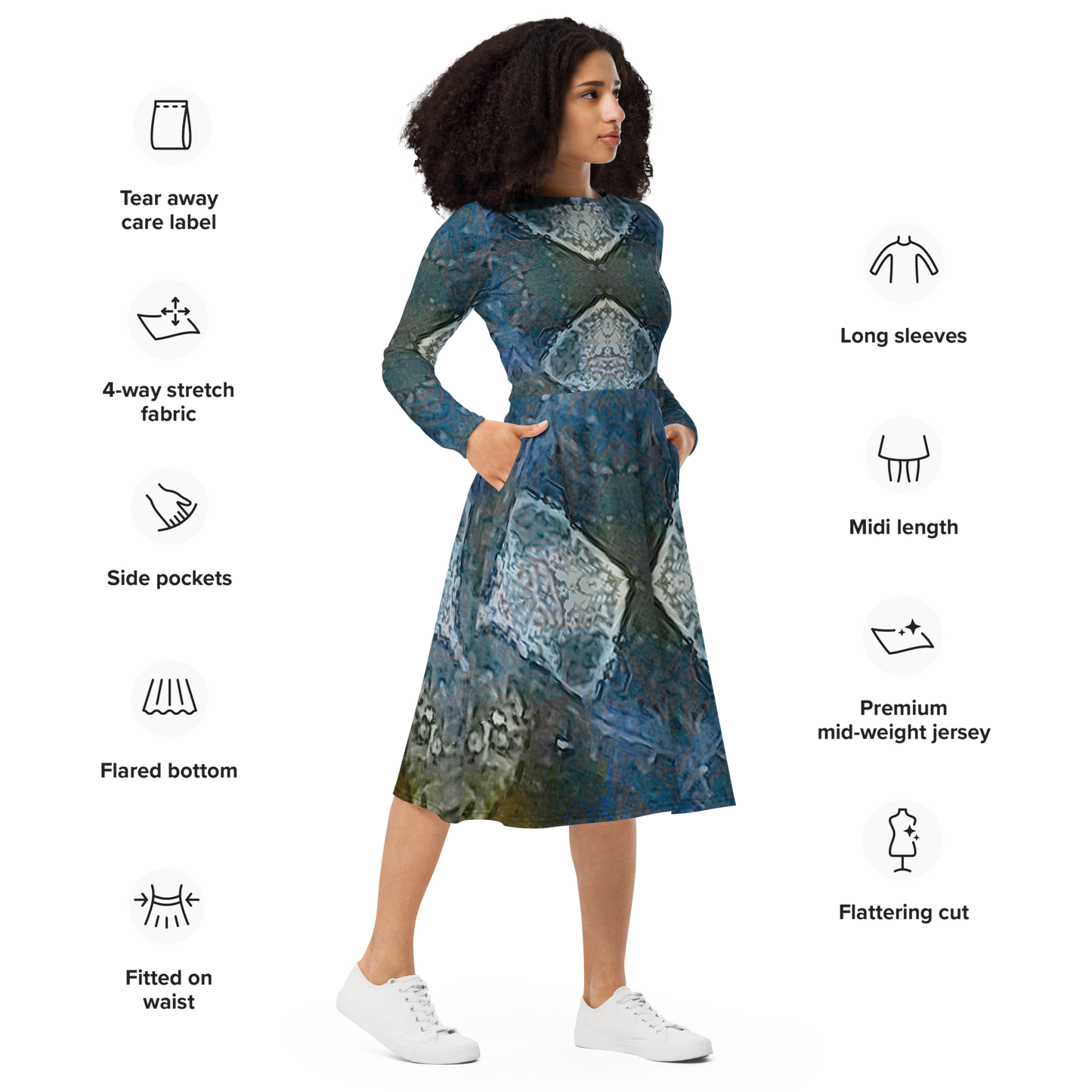 Meticulously crafted in premium knit mid-weight jersey, this midi-length dress offers timeless versatility. The fitted waist and flared bottom part create a flattering shape, while long sleeves and a classic boat neckline add sophistication. Side pockets give practicality, elevating the dress into an everyday essential that can shift effortlessly from casual to formal. Printed with exclusive artwork from River Jade Smith Travis Huffaker, each piece is unique—an investment in wearable art.