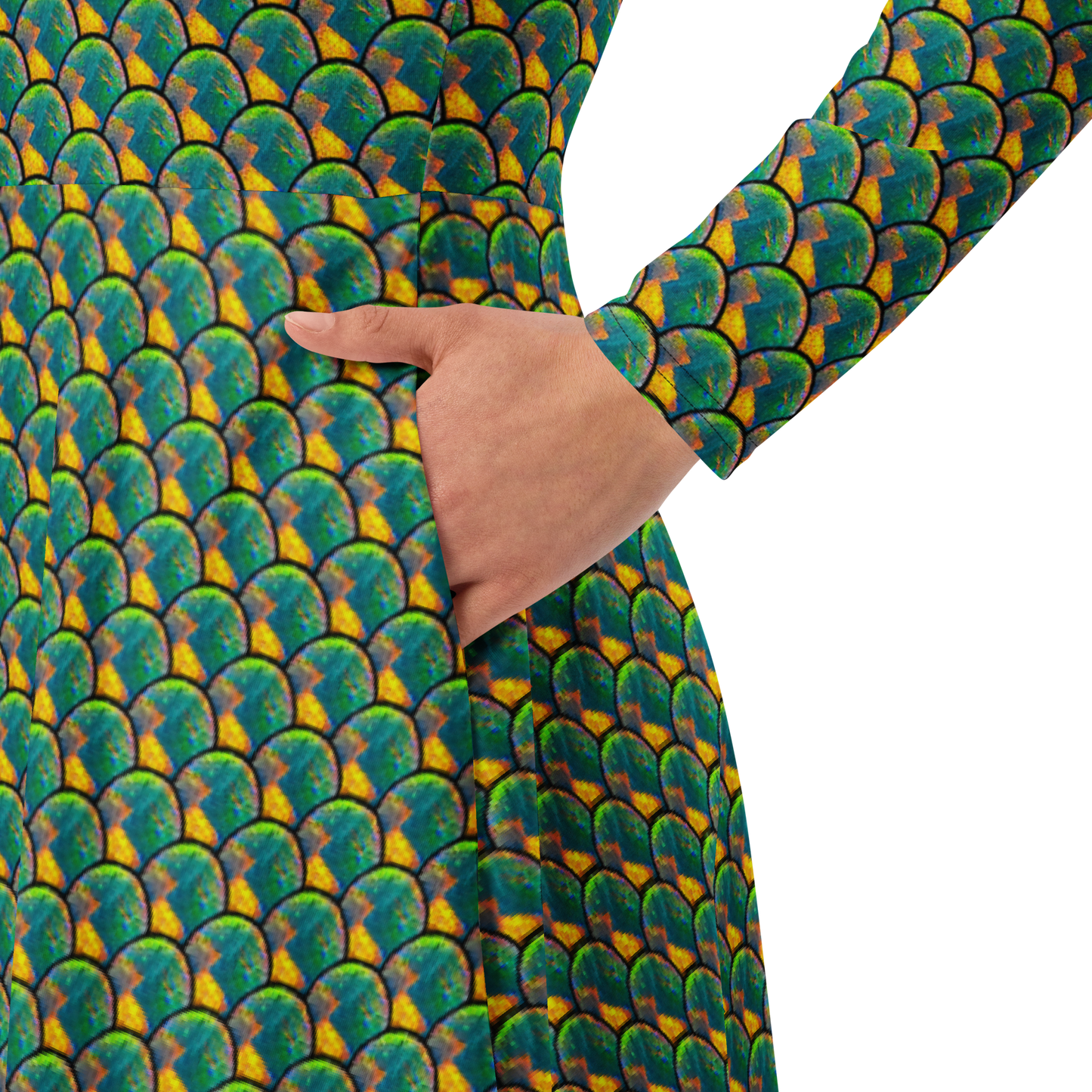 Step into grace and mythic artistry with the Long Sleeve Midi Dress (Her/Muliebris). Designed with sustainability, beauty, and artisan quality, this piece brings together a flattering silhouette, functional pockets, and the brilliance of original art by River Jade Smith Travis Huffaker. A garment of comfort and style, made-to-order to honor both you and the Earth.