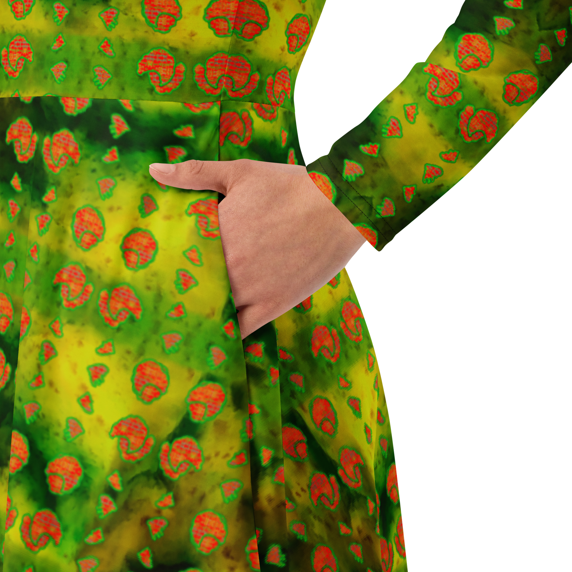 Brand’s Involvement: River Jade Smithy brings the long sleeve midi into the realm of living art. Printed with RJSTH’s original artwork, each piece is a testament to Green Worth Grail Smith philosophy: fashion as moral armor and beauty as resistance. Made-to-order with Printful, this dress curbs overproduction and affirms sustainability.