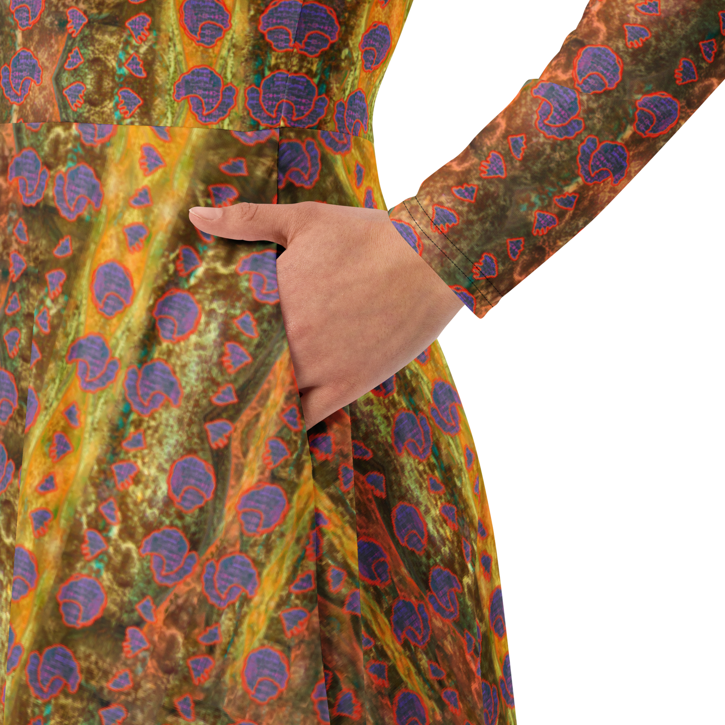 Meticulously crafted in premium knit mid-weight jersey, this midi-length dress offers timeless versatility. The fitted waist and flared bottom part create a flattering shape, while long sleeves and a classic boat neckline add sophistication. Side pockets give practicality, elevating the dress into an everyday essential that can shift effortlessly from casual to formal. Printed with exclusive artwork from River Jade Smith Travis Huffaker, each piece is unique—an investment in wearable art.