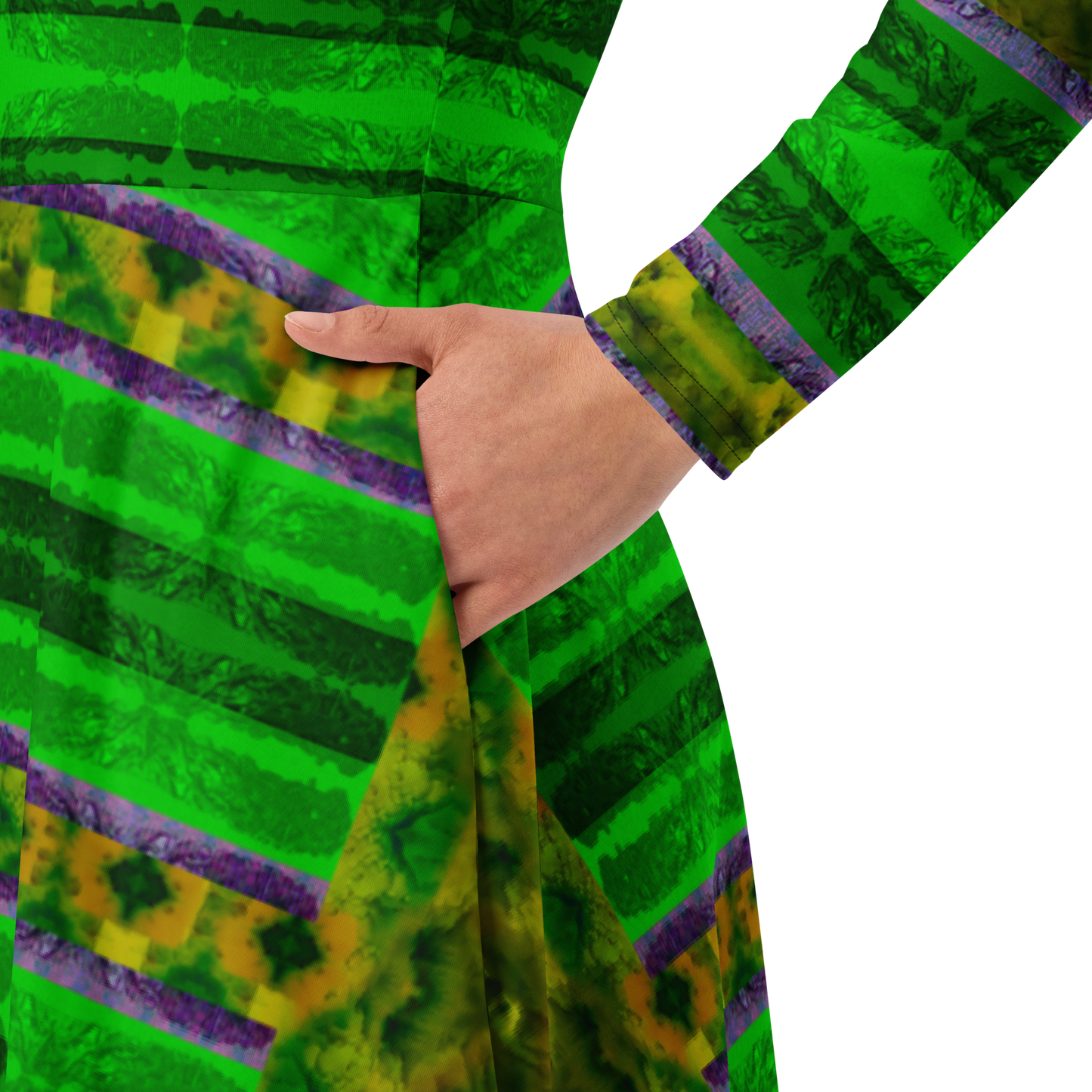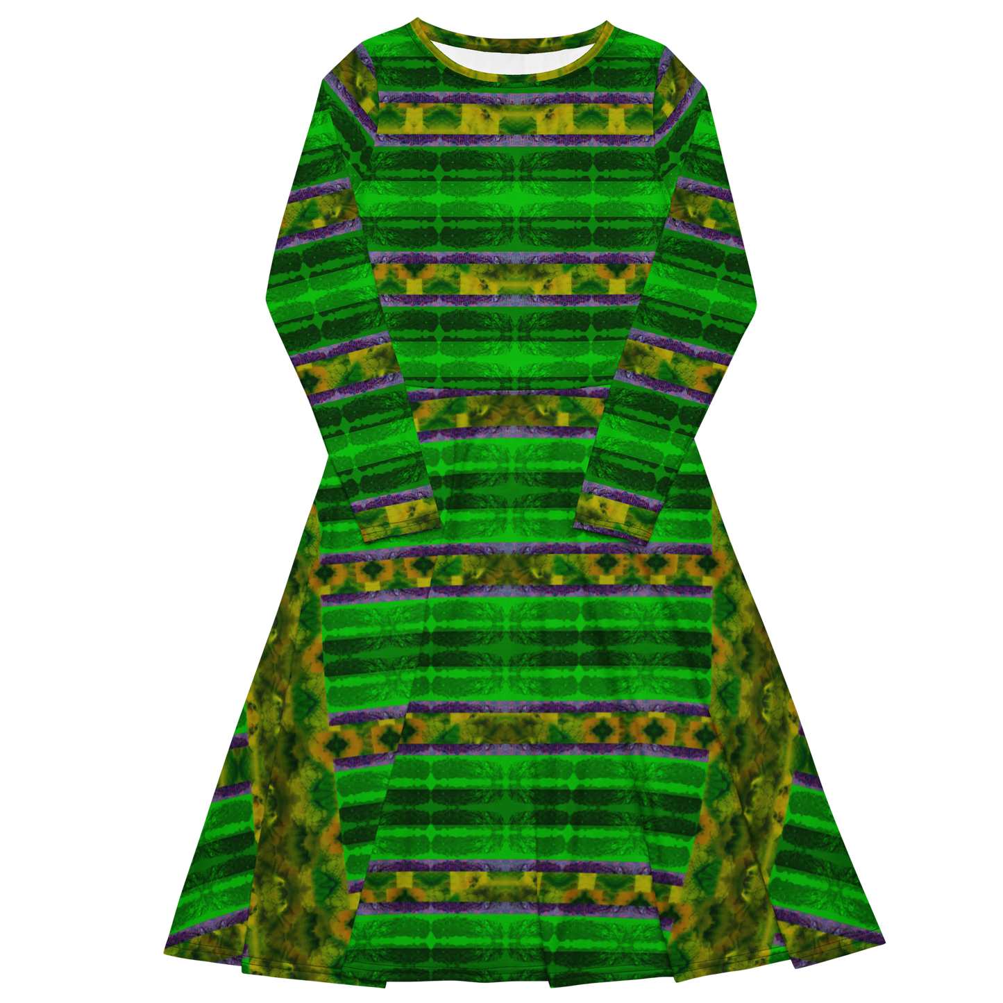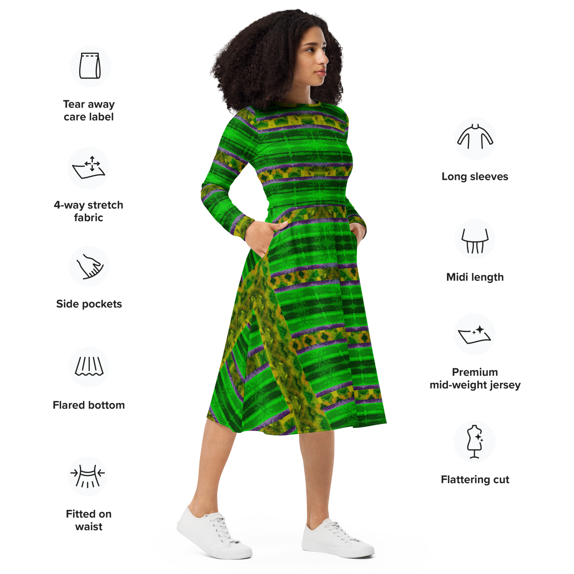 Meticulously crafted in premium knit mid-weight jersey, this midi-length dress offers timeless versatility. The fitted waist and flared bottom part create a flattering shape, while long sleeves and a classic boat neckline add sophistication. Side pockets give practicality, elevating the dress into an everyday essential that can shift effortlessly from casual to formal. Printed with exclusive artwork from River Jade Smith Travis Huffaker, each piece is unique—an investment in wearable art.