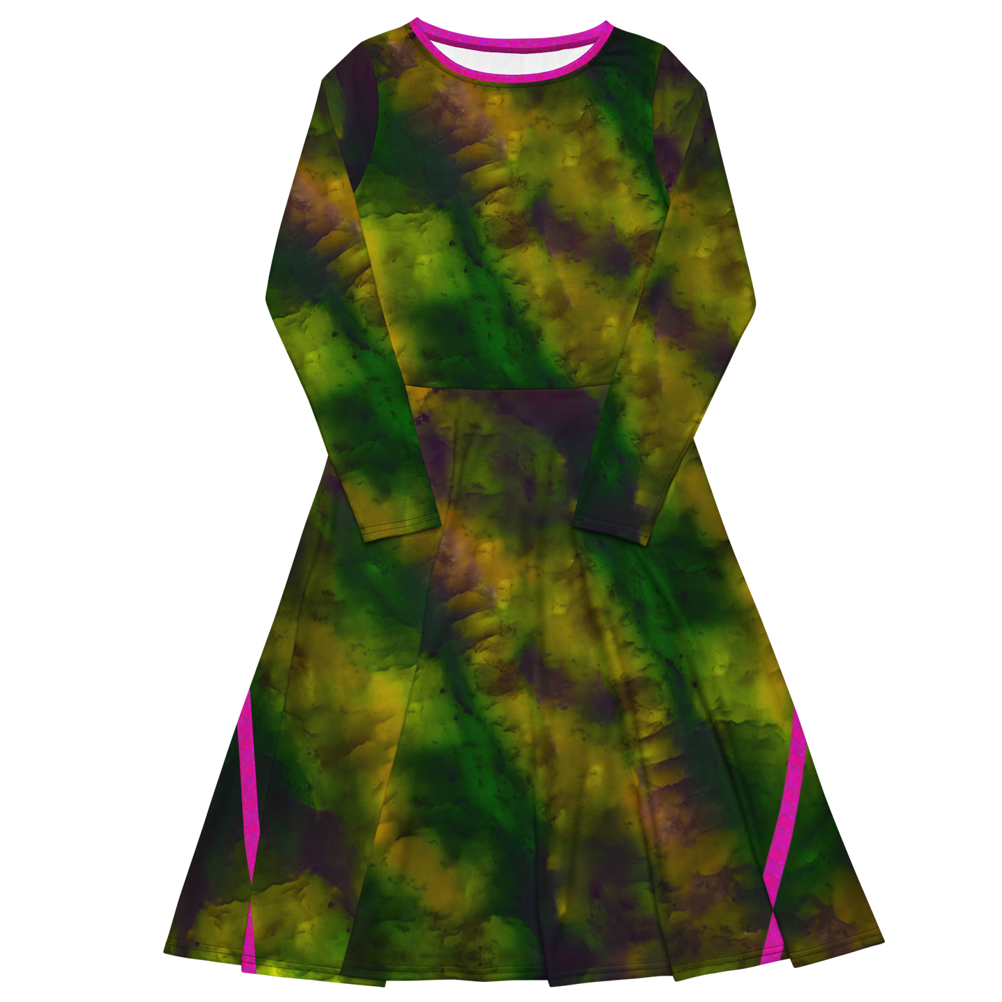 Meticulously crafted in premium knit mid-weight jersey, this midi-length dress offers timeless versatility. The fitted waist and flared bottom part create a flattering shape, while long sleeves and a classic boat neckline add sophistication. Side pockets give practicality, elevating the dress into an everyday essential that can shift effortlessly from casual to formal. Printed with exclusive artwork from River Jade Smith Travis Huffaker, each piece is unique—an investment in wearable art.