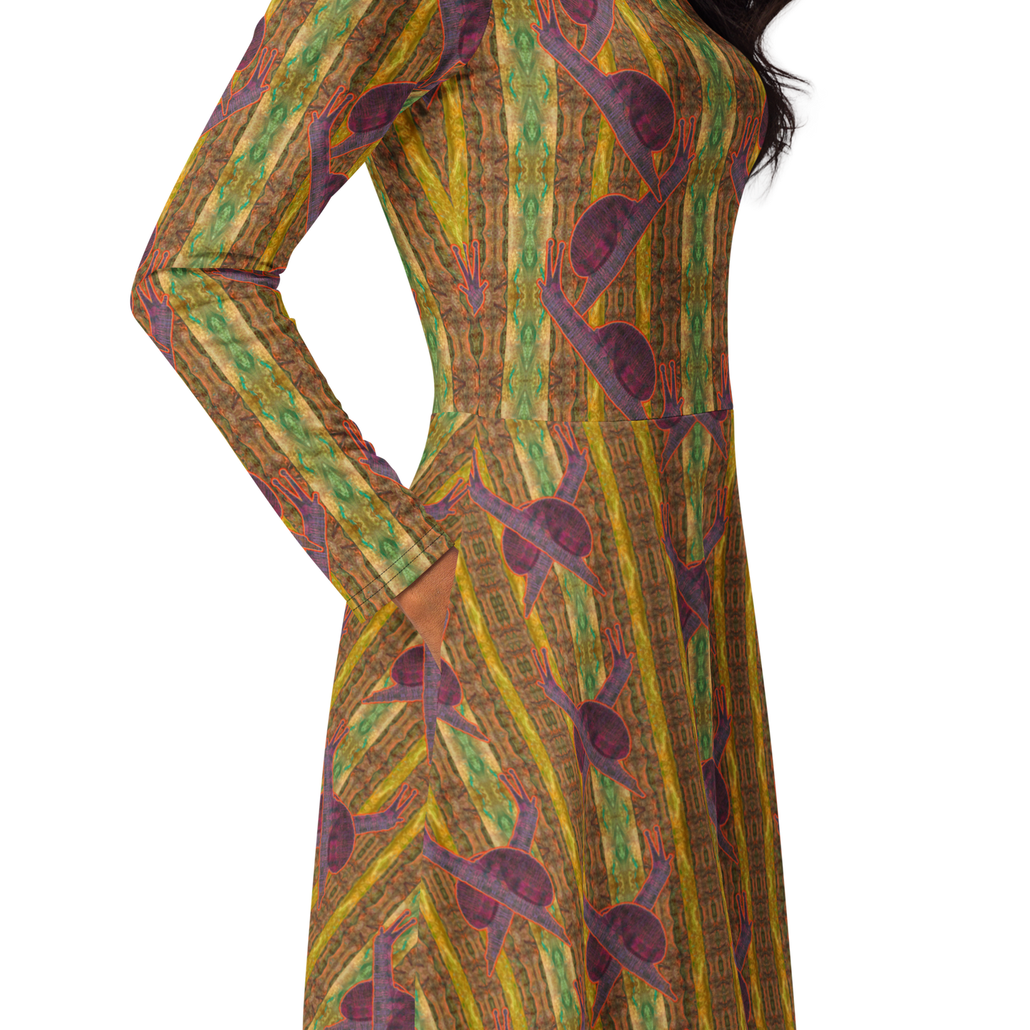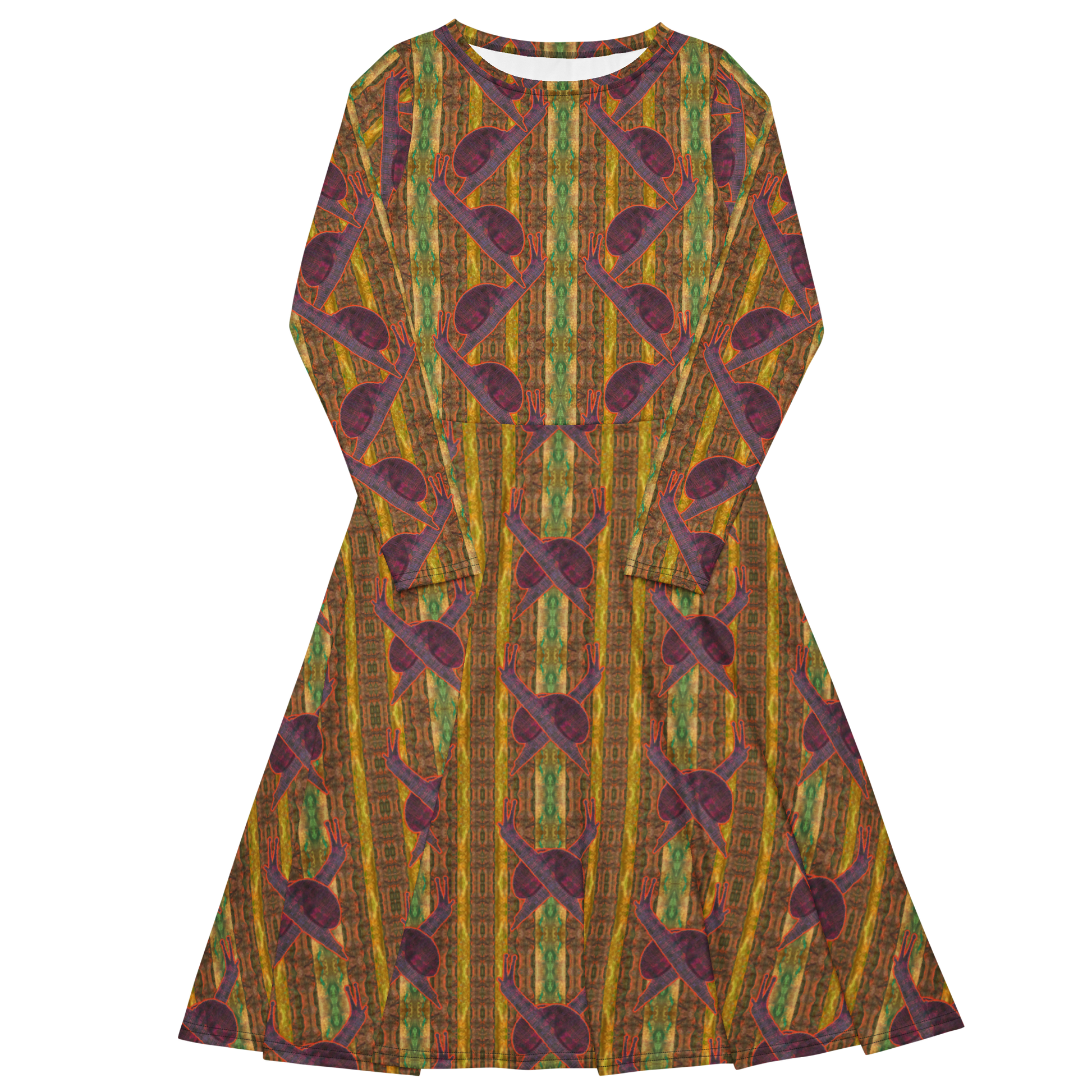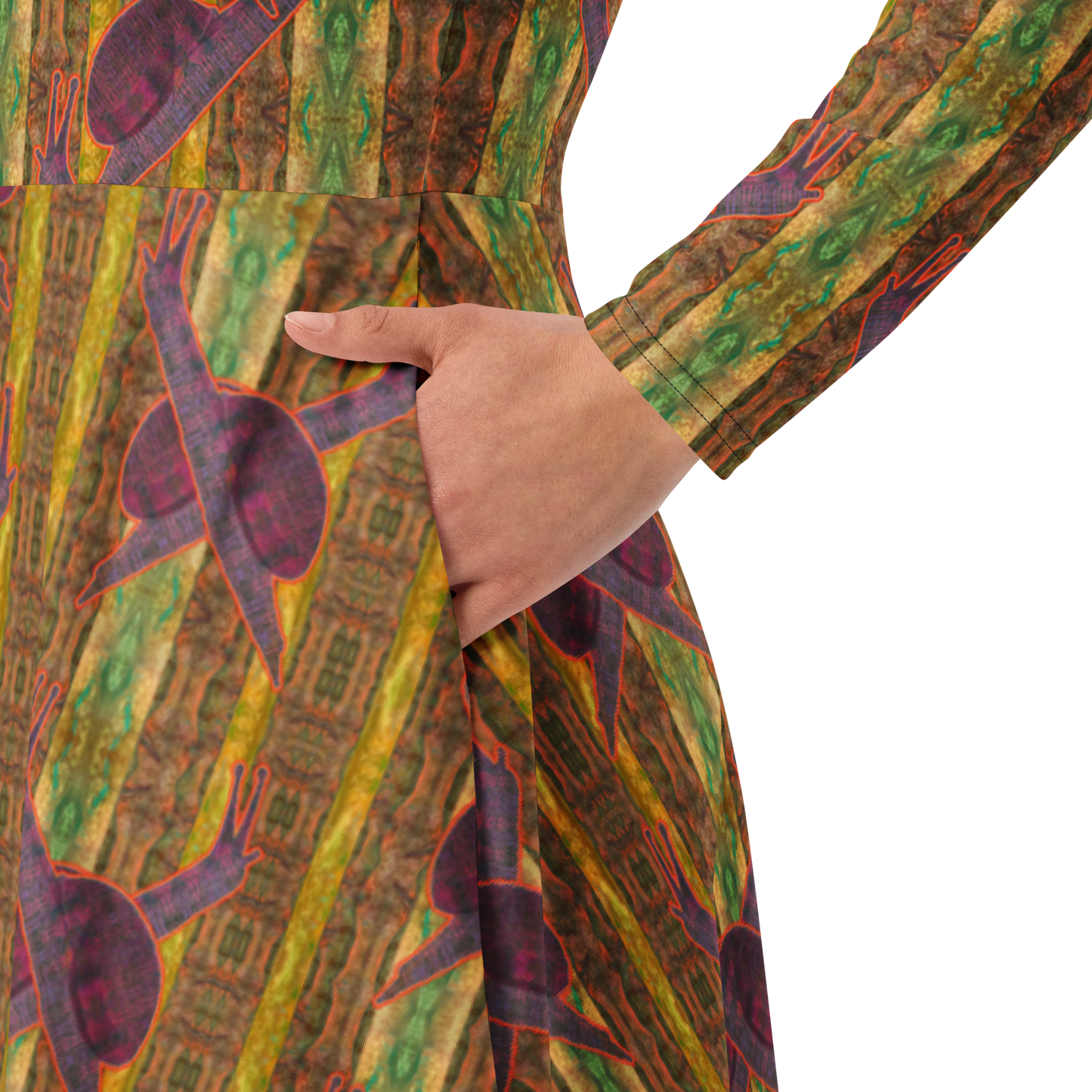 Meticulously crafted in premium knit mid-weight jersey, this midi-length dress offers timeless versatility. The fitted waist and flared bottom part create a flattering shape, while long sleeves and a classic boat neckline add sophistication. Side pockets give practicality, elevating the dress into an everyday essential that can shift effortlessly from casual to formal. Printed with exclusive artwork from River Jade Smith Travis Huffaker, each piece is unique—an investment in wearable art.