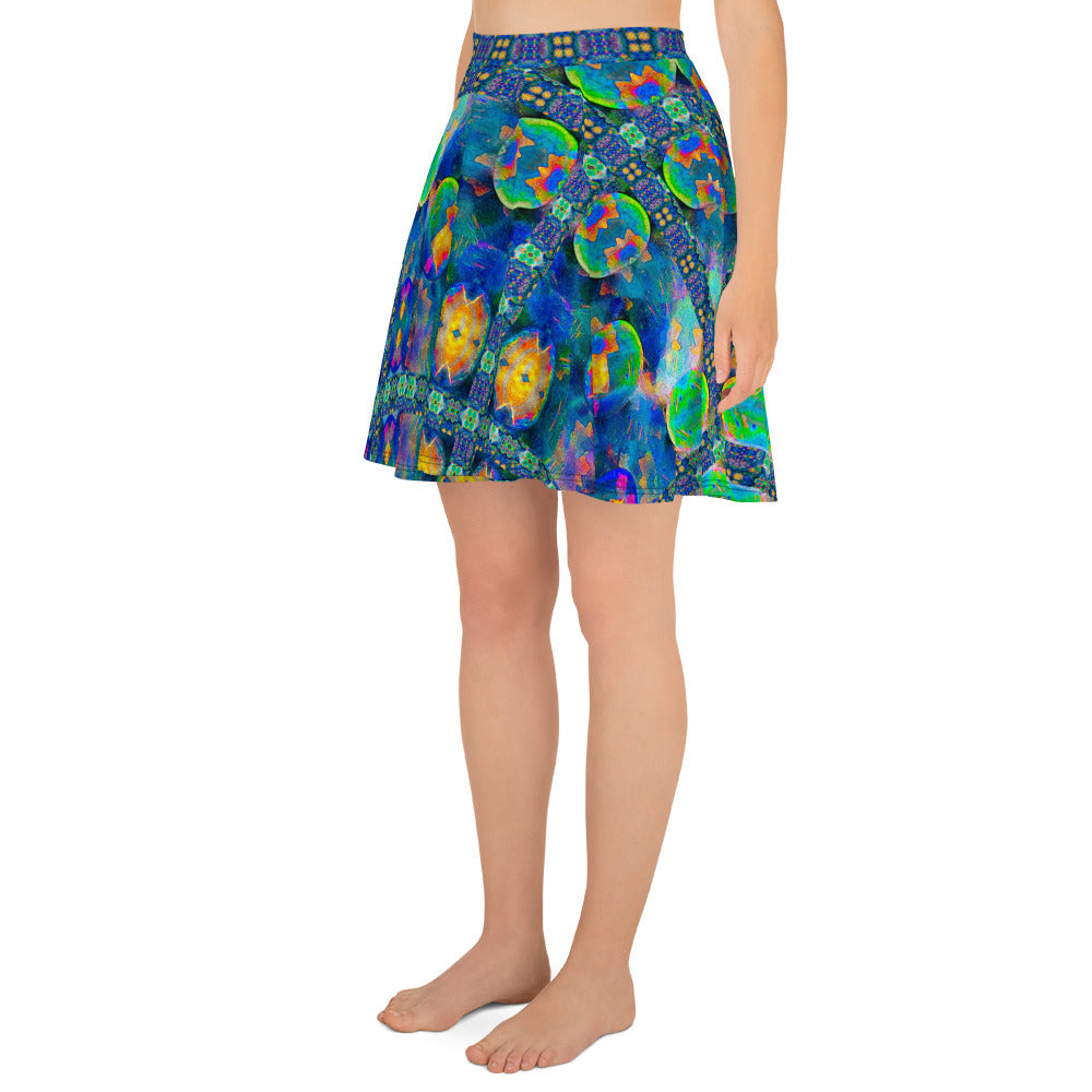 Sustainably made, art-infused skater skirt with UPF 50+, soft peach-skin feel, and four-way stretch. Original artwork by River Jade Smith Travis “Doby” Huffaker. Printed, cut, and hand-sewn by our partners at Printful.
