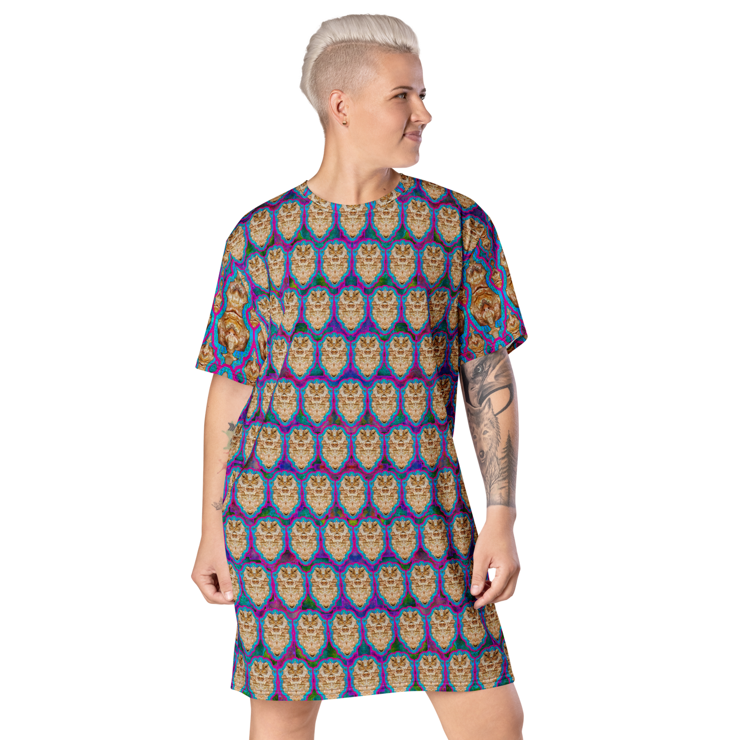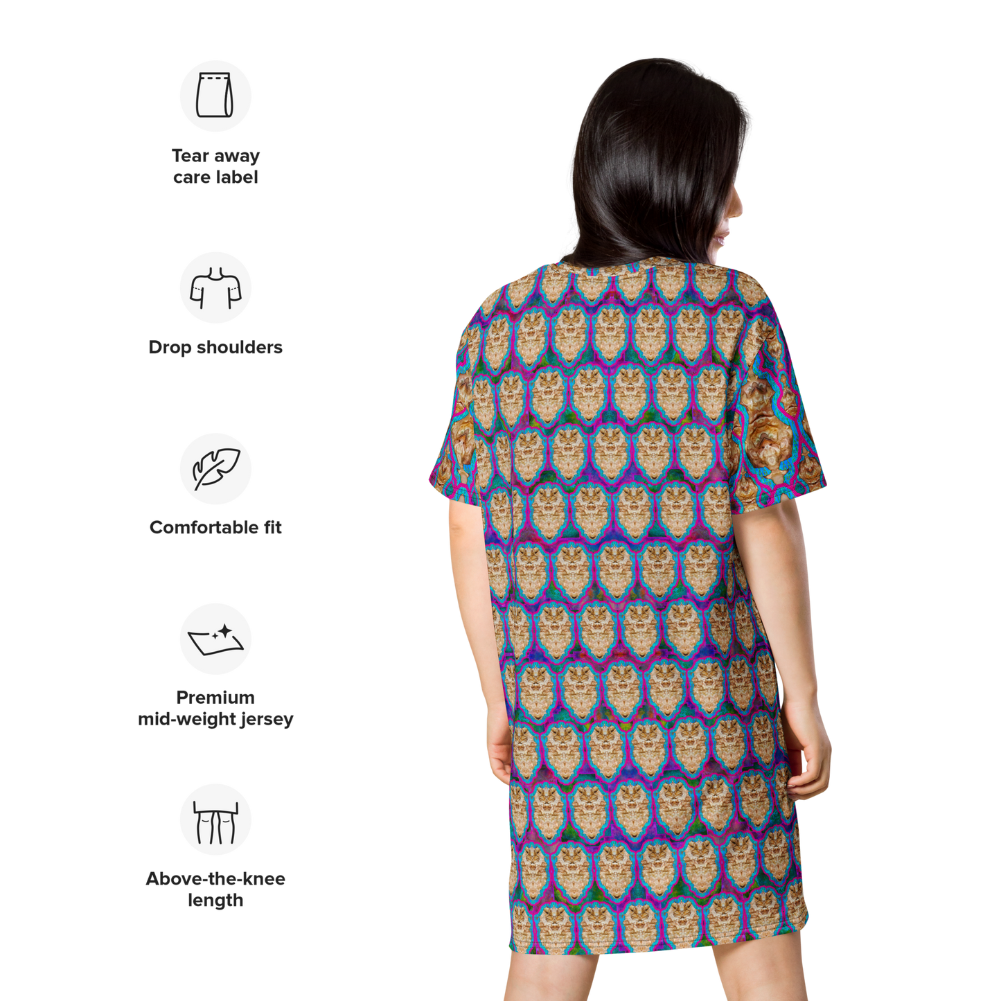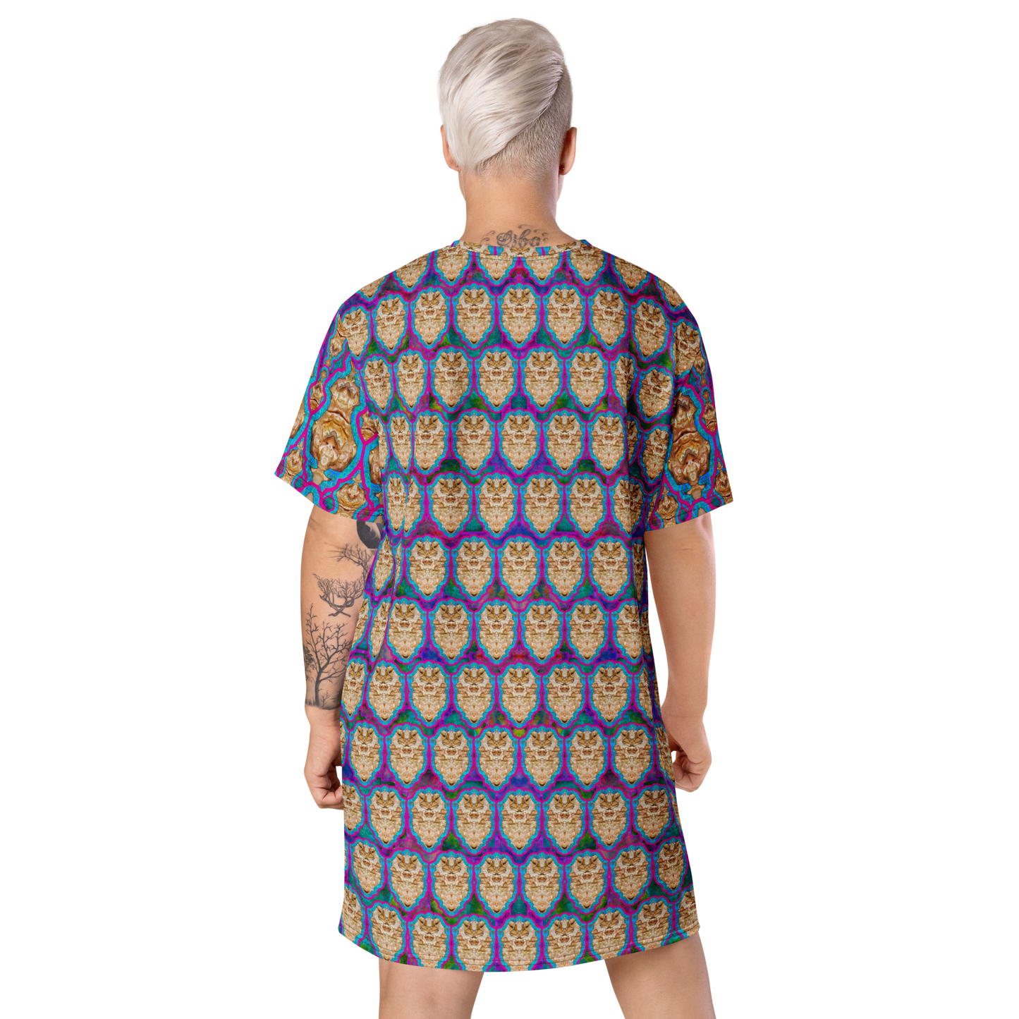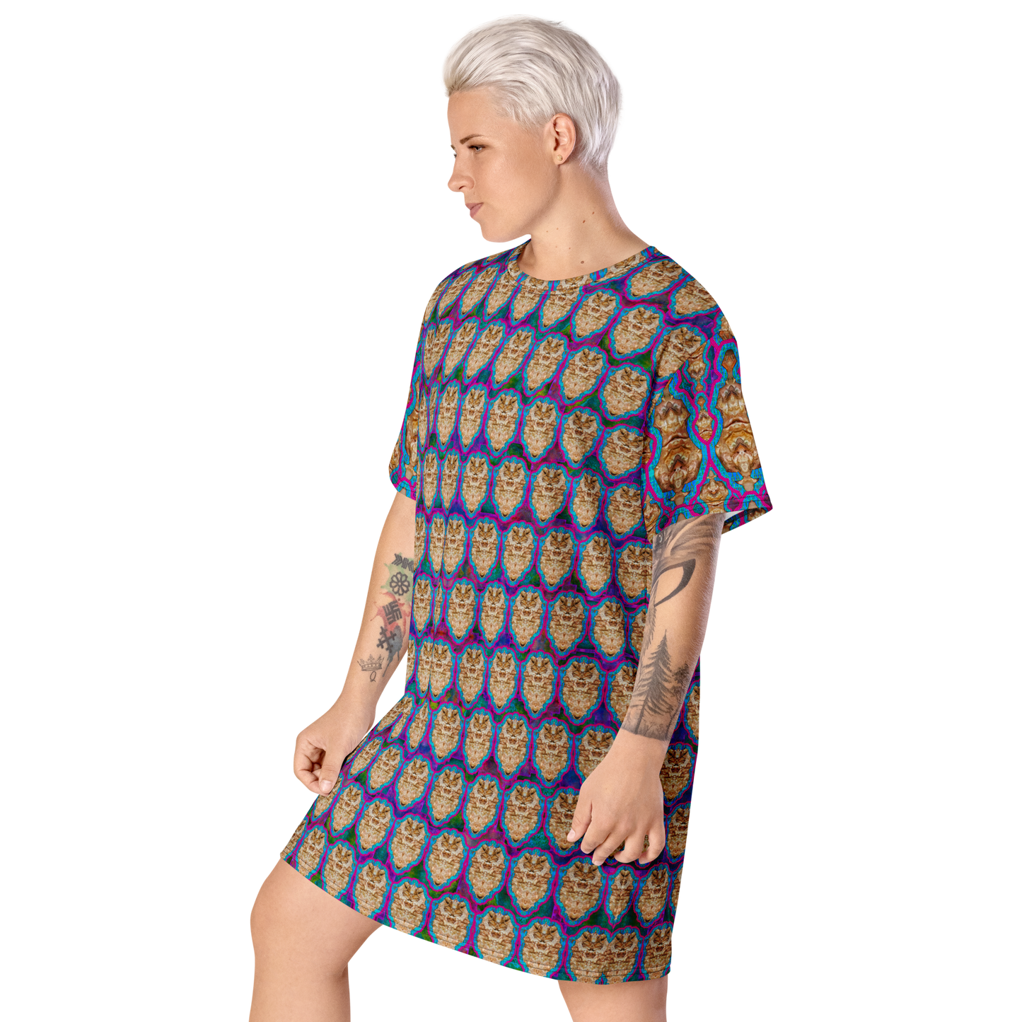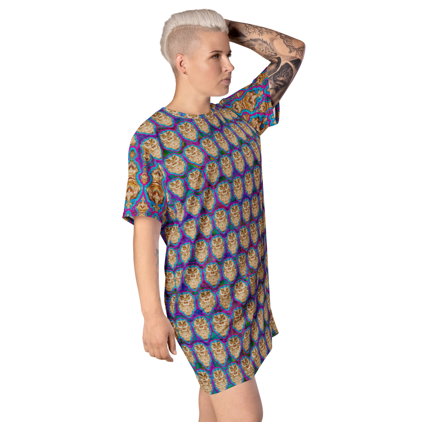 Made from eco-friendly, OEKO-TEX 100 standard-certified fabric, the All-Over Print T-Shirt Tunic feels like a second skin while making a bold statement. Its oversized fit and dropped shoulders ensure comfort and freedom of movement, while its handcrafted designs bring elegance and individuality to every look.