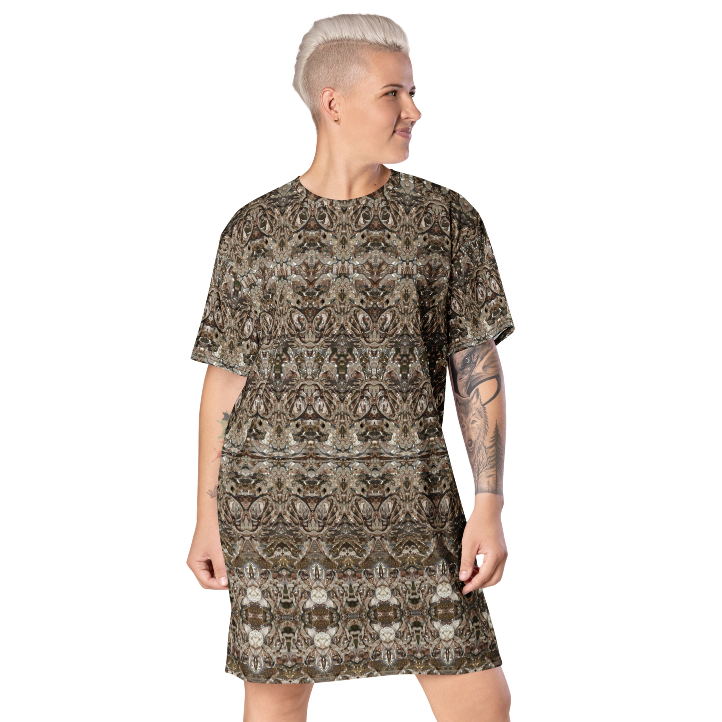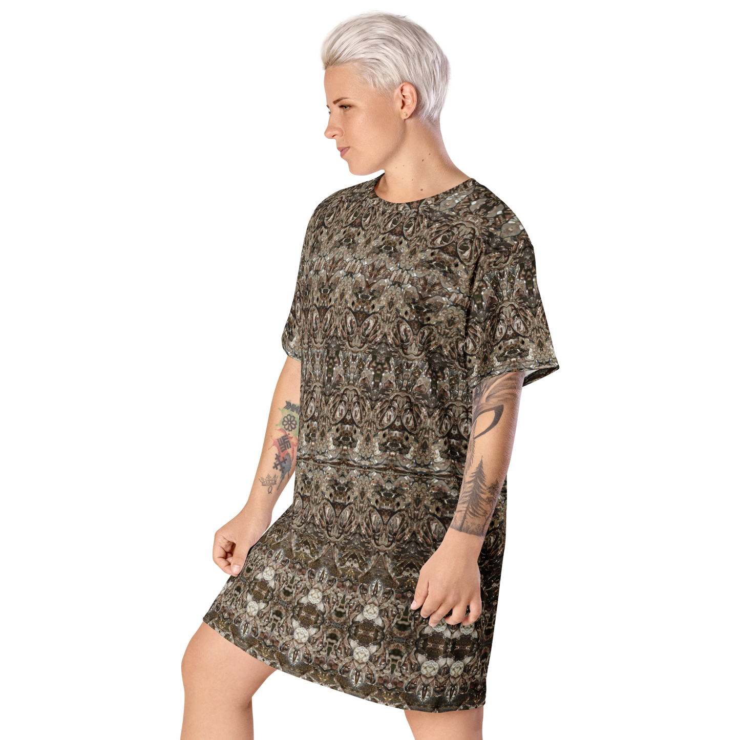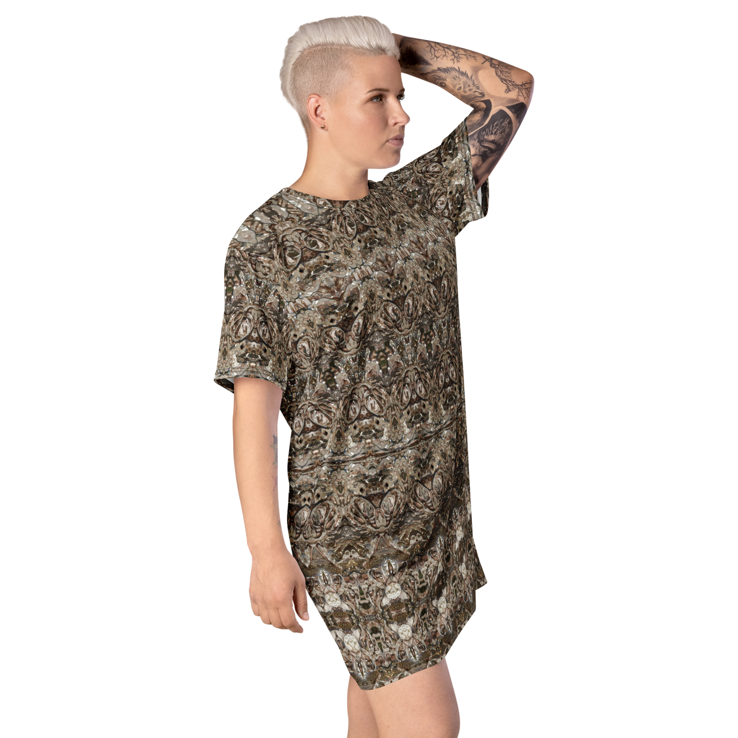 Made from eco-friendly, OEKO-TEX 100 standard-certified fabric, the All-Over Print T-Shirt Tunic feels like a second skin while making a bold statement. Its oversized fit and dropped shoulders ensure comfort and freedom of movement, while its handcrafted designs bring elegance and individuality to every look.