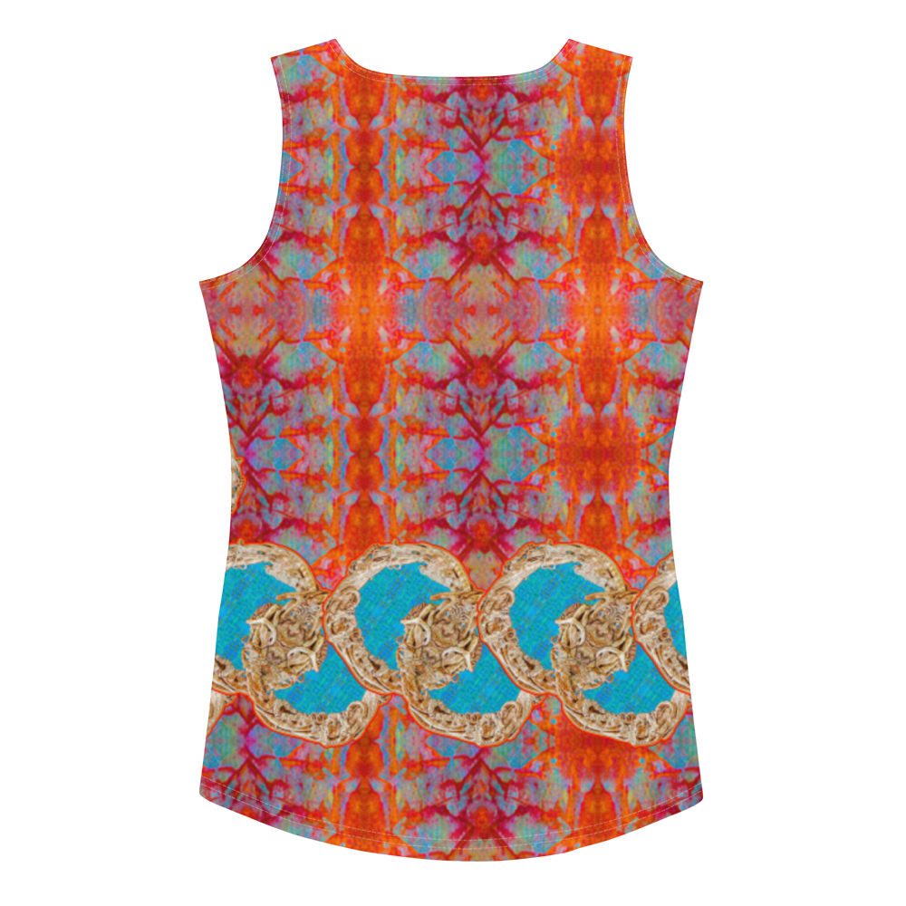 Inspired by the dynamic interplay of art and nature, the tank top’s prints evoke images of Hammered and smithed copper, underlit jade, and raku fired ceramic glass. These designs reflect the Ancient Future vision, blending mystical elements with cutting-edge fashion.