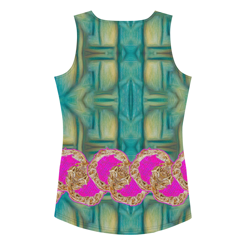 Inspired by the dynamic interplay of art and nature, the tank top’s prints evoke images of Hammered and smithed copper, underlit jade, and raku fired ceramic glass. These designs reflect the Ancient Future vision, blending mystical elements with cutting-edge fashion.