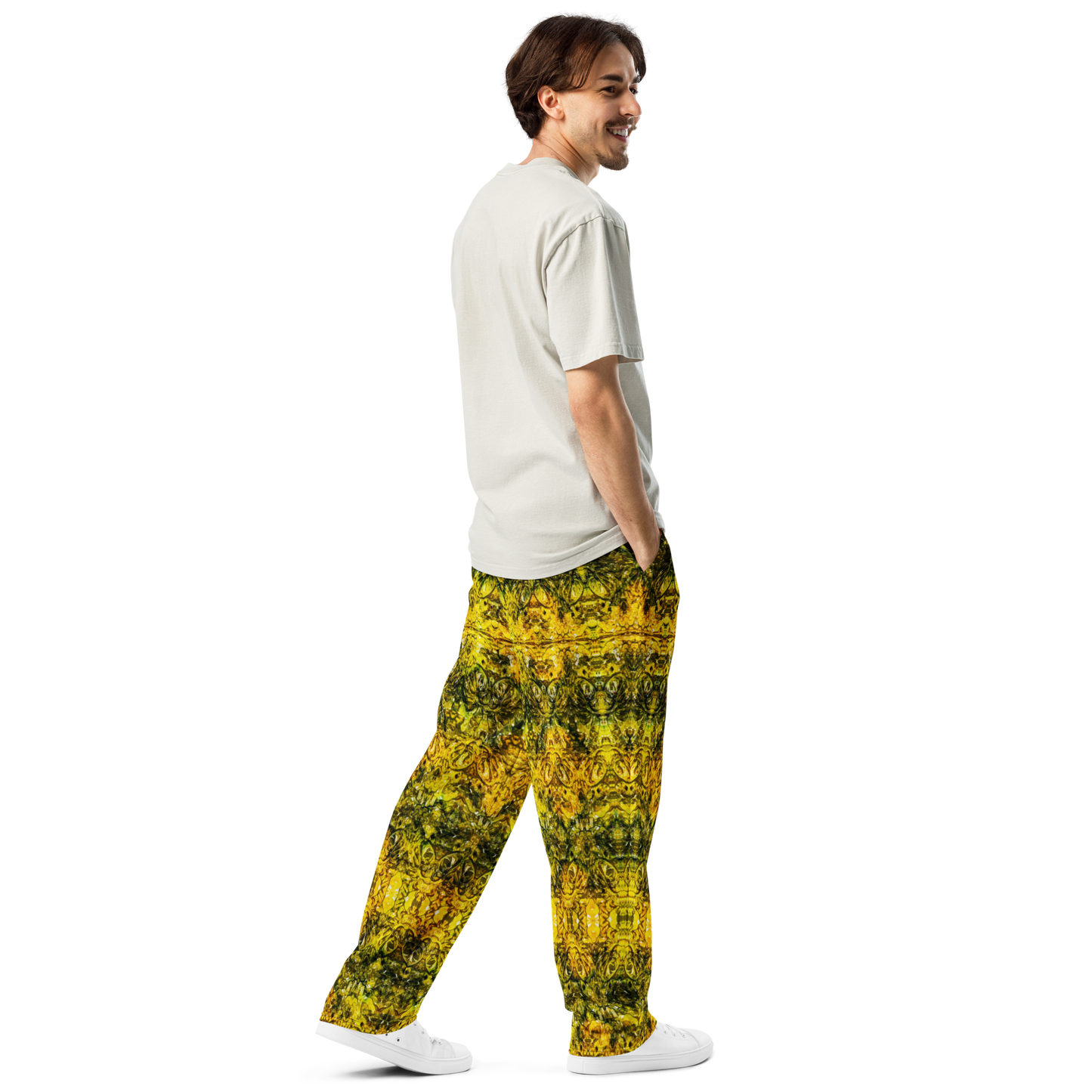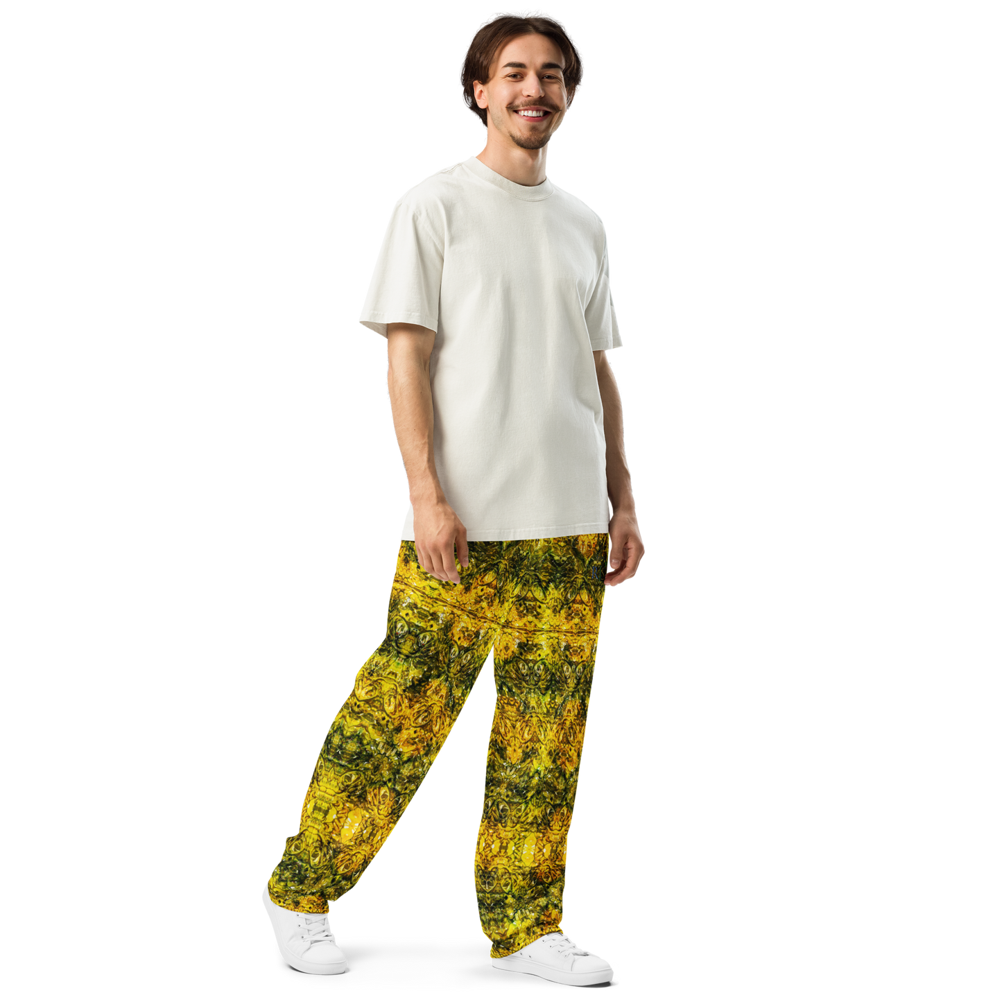 Crafted with precision and care, the Wide-Leg Joggers deliver a relaxed fit and contemporary silhouette. A smooth elastic waistband with an adjustable drawstring ensures comfort, while practical side pockets enhance utility. The fabric’s vibrant all-over print celebrates individuality, making each piece a wearable work of RJSTH original art. Lightweight yet durable, these joggers transition seamlessly from casual outings to creative ventures.