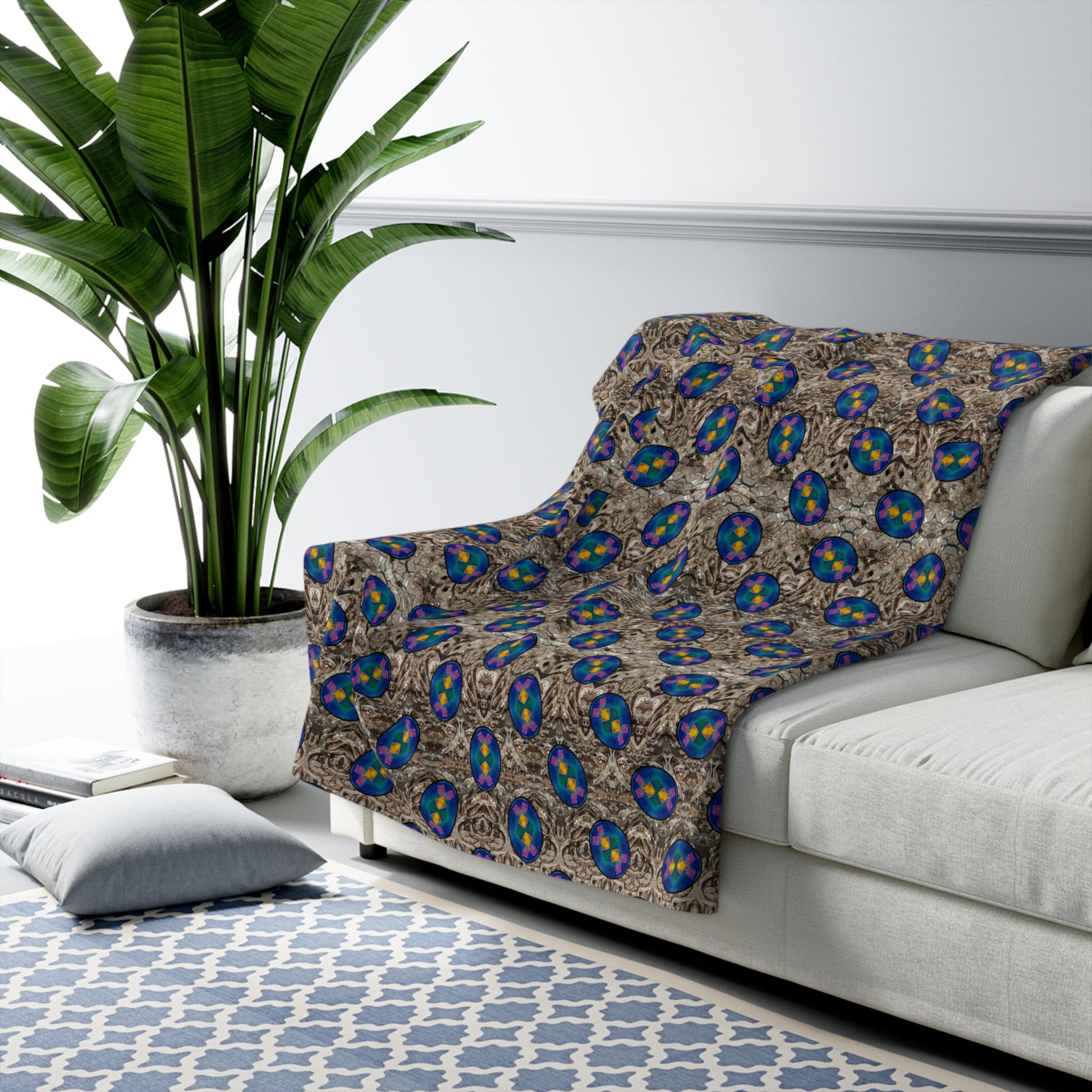 Functional Details: One-sided print with a plush Sherpa backside; hemmed edges for durability.