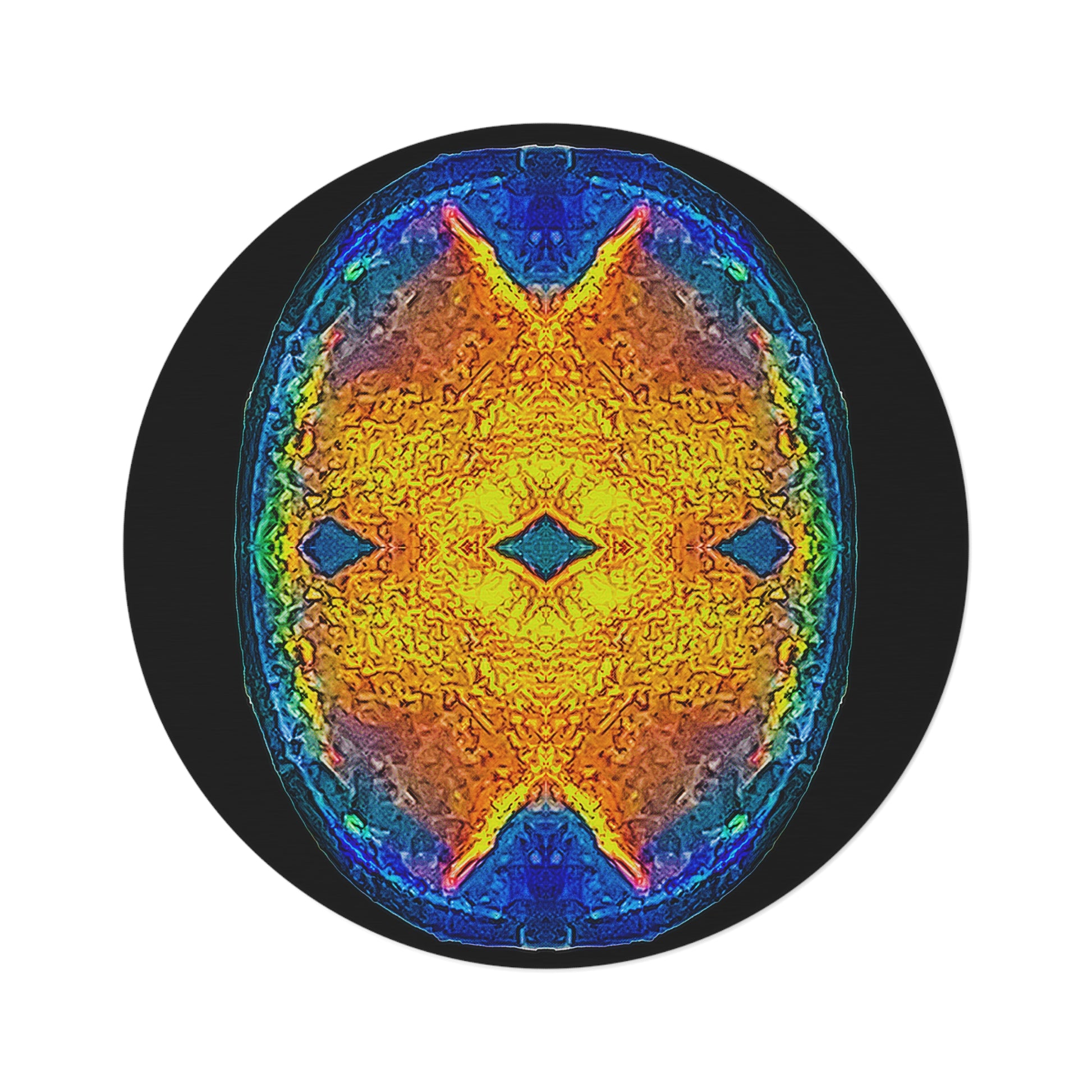 Handcrafted on demand from 100% polyester chenille, the Tapis Circulāris features a durable textured face with hemmed edges and a coated backing for longevity. Measuring 60 in (152 cm) in diameter with a gentle 0.2 in (5 mm) thickness, it balances plushness and resilience. Its vibrant imagery—printed in picture-perfect quality—radiates warmth in any setting. Beyond the floor, it may also be hung as wall art, used as a meditative mat, or integrated into the wearer’s own couture of creativity—a radiant disc of pattern, grounding fashion with mythic gravity.
