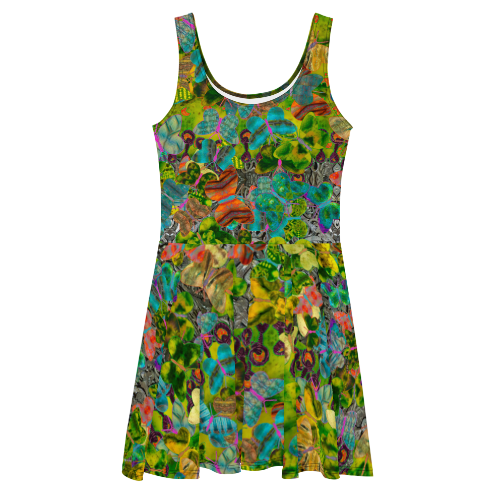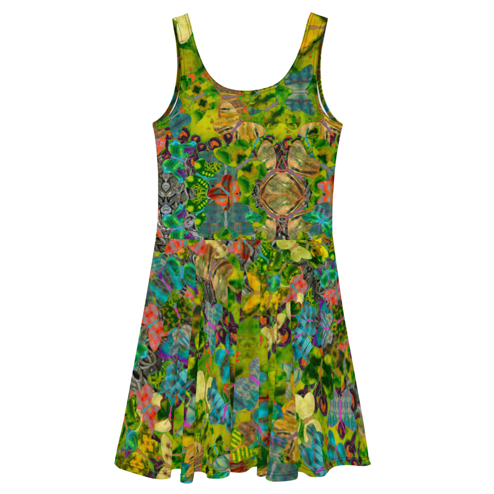 Crafted from soft, elastic fabric that feels like a second skin, this sleeveless skater dress combines comfort with visual impact. Featuring custom, all-over prints inspired by the original artwork of RJSTH, each dress is a wearable masterpiece. The flared, mid-thigh skirt creates an enchanting twirl, while the elastic waistline ensures a perfect fit for every body type.