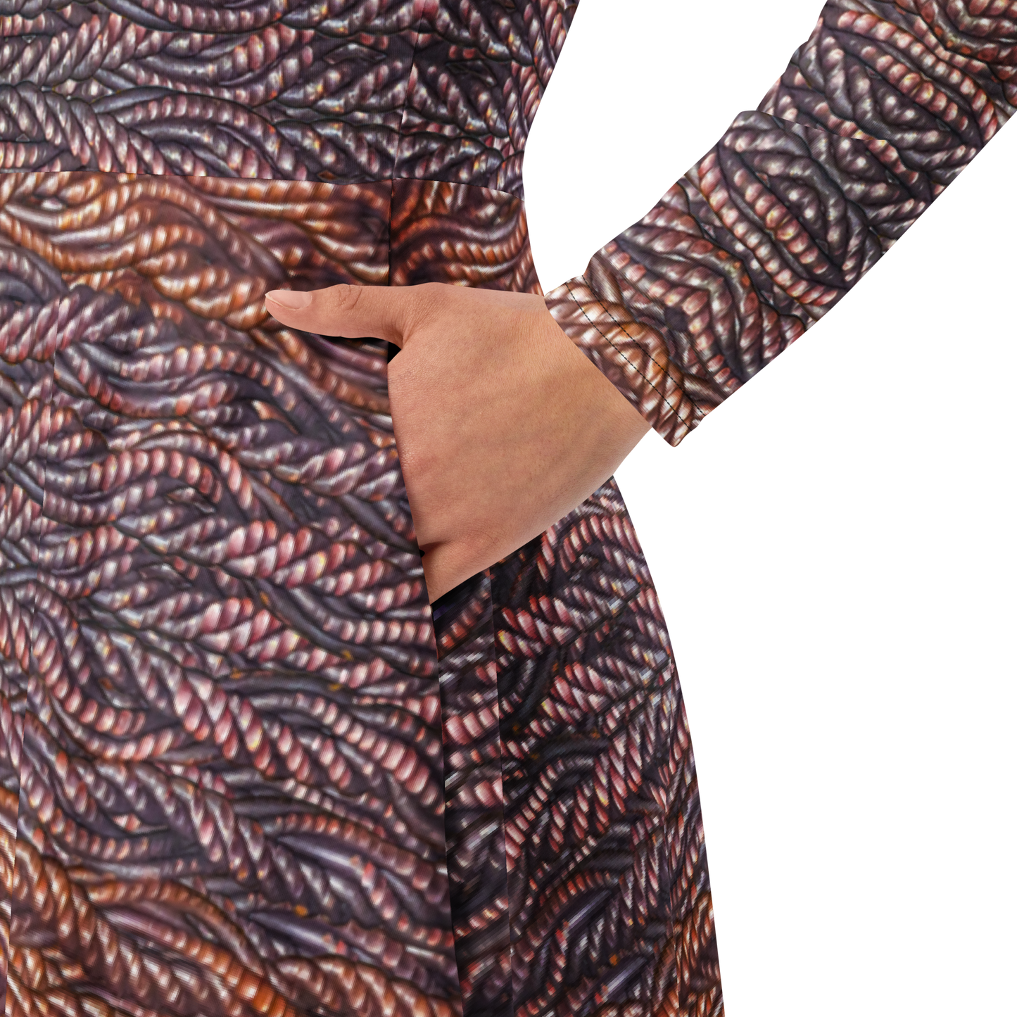 Meticulously crafted in premium knit mid-weight jersey, this midi-length dress offers timeless versatility. The fitted waist and flared bottom part create a flattering shape, while long sleeves and a classic boat neckline add sophistication. Side pockets give practicality, elevating the dress into an everyday essential that can shift effortlessly from casual to formal. Printed with exclusive artwork from River Jade Smith Travis Huffaker, each piece is unique—an investment in wearable art.