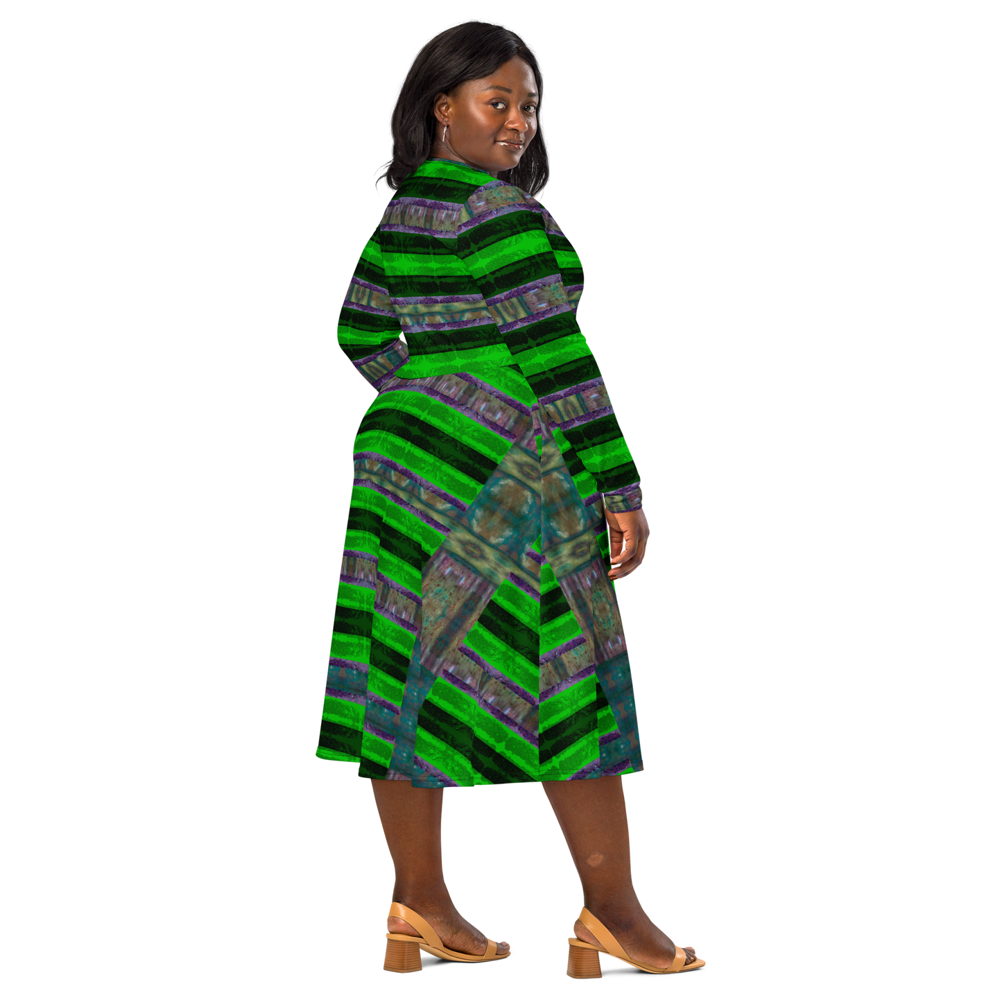 Brand’s Involvement: River Jade Smithy brings the long sleeve midi into the realm of living art. Printed with RJSTH’s original artwork, each piece is a testament to Green Worth Grail Smith philosophy: fashion as moral armor and beauty as resistance. Made-to-order with Printful, this dress curbs overproduction and affirms sustainability.