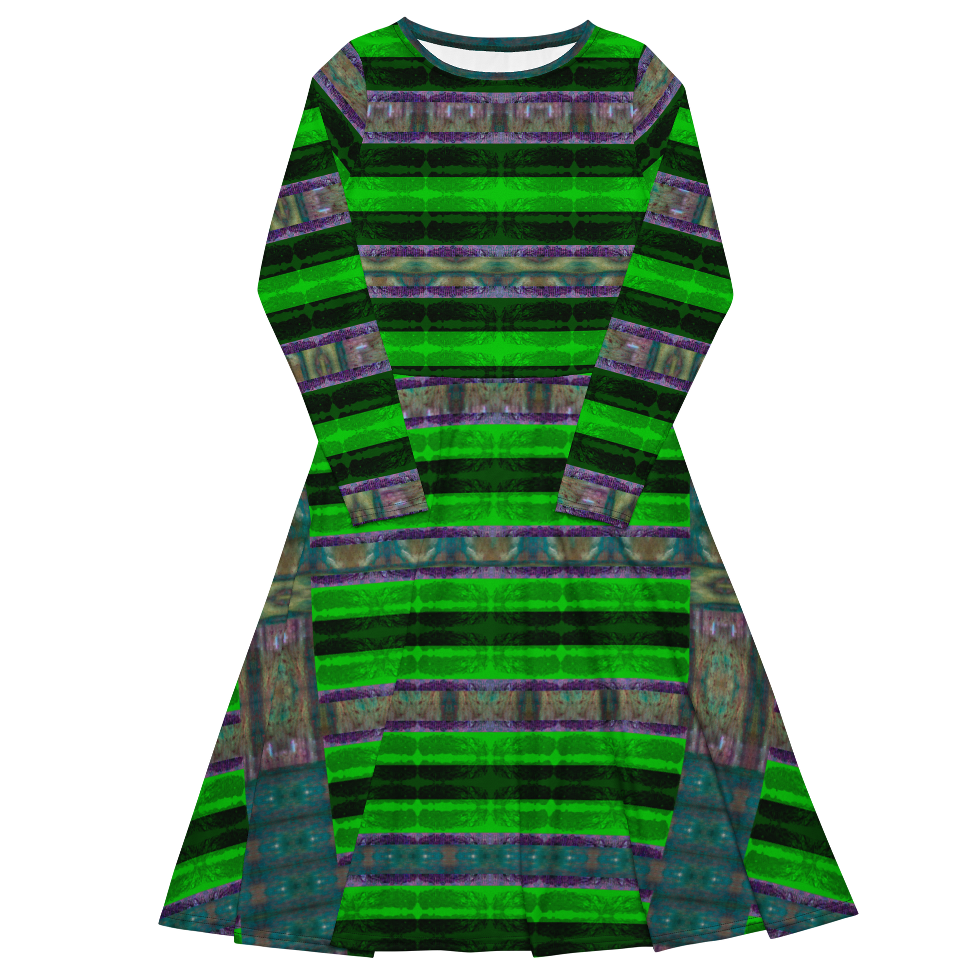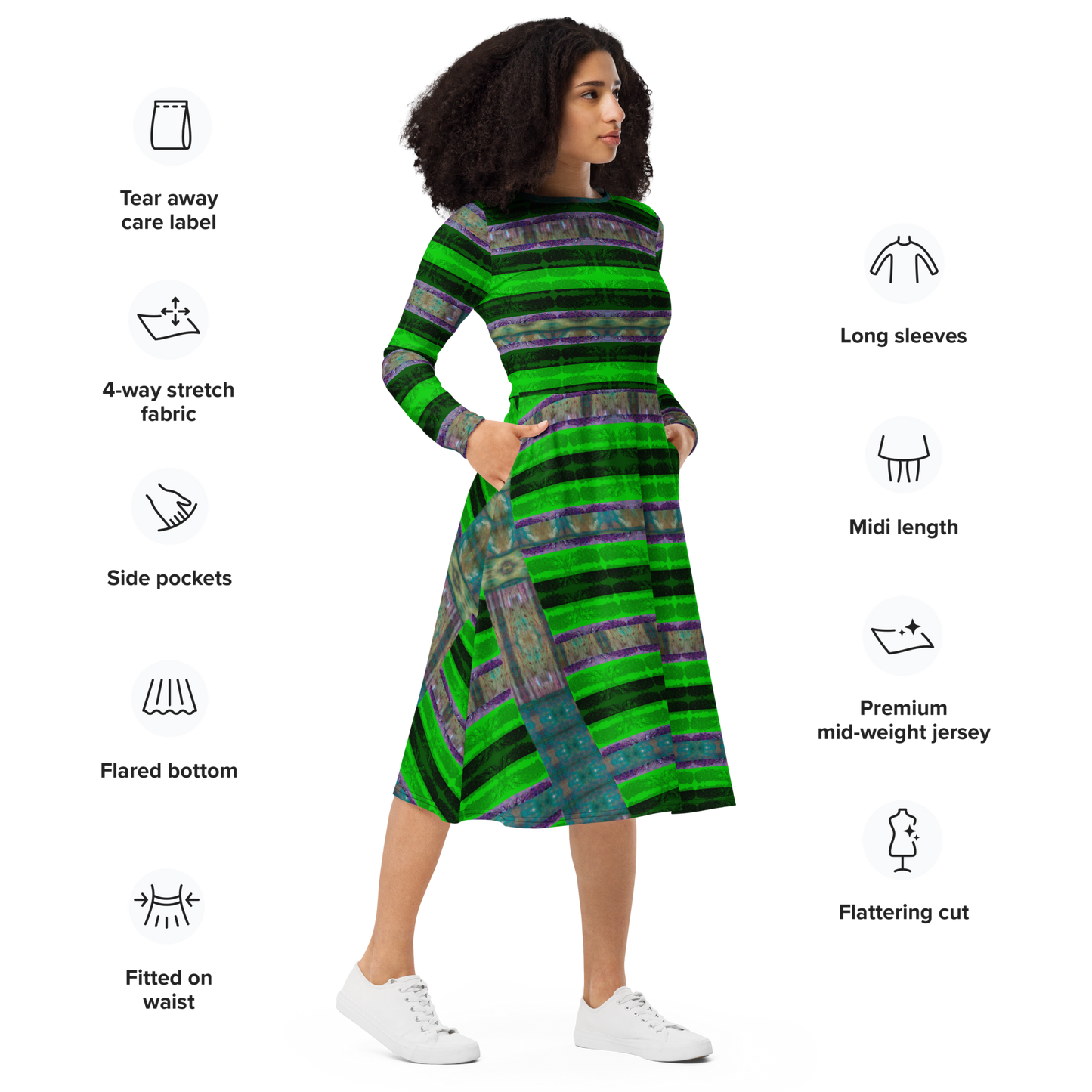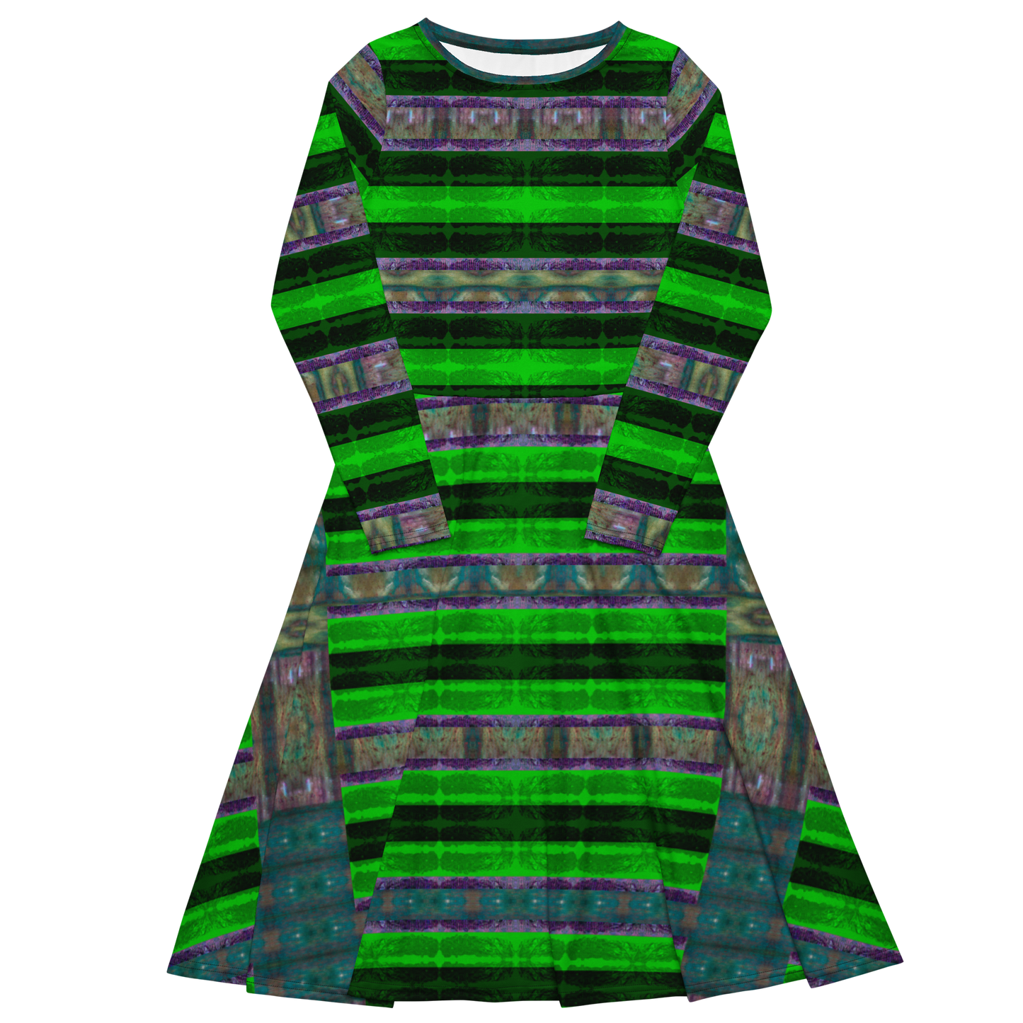 Meticulously crafted in premium knit mid-weight jersey, this midi-length dress offers timeless versatility. The fitted waist and flared bottom part create a flattering shape, while long sleeves and a classic boat neckline add sophistication. Side pockets give practicality, elevating the dress into an everyday essential that can shift effortlessly from casual to formal. Printed with exclusive artwork from River Jade Smith Travis Huffaker, each piece is unique—an investment in wearable art.