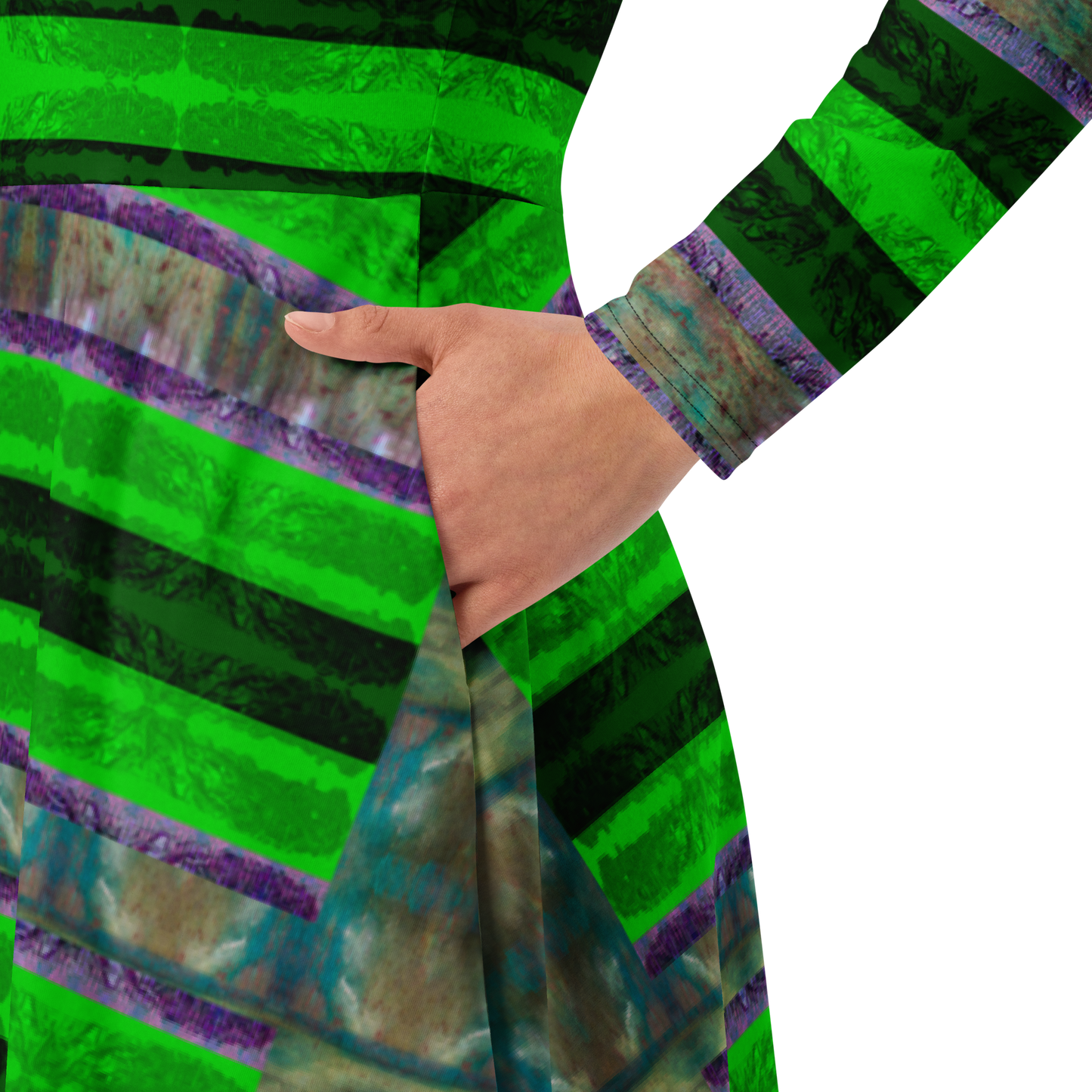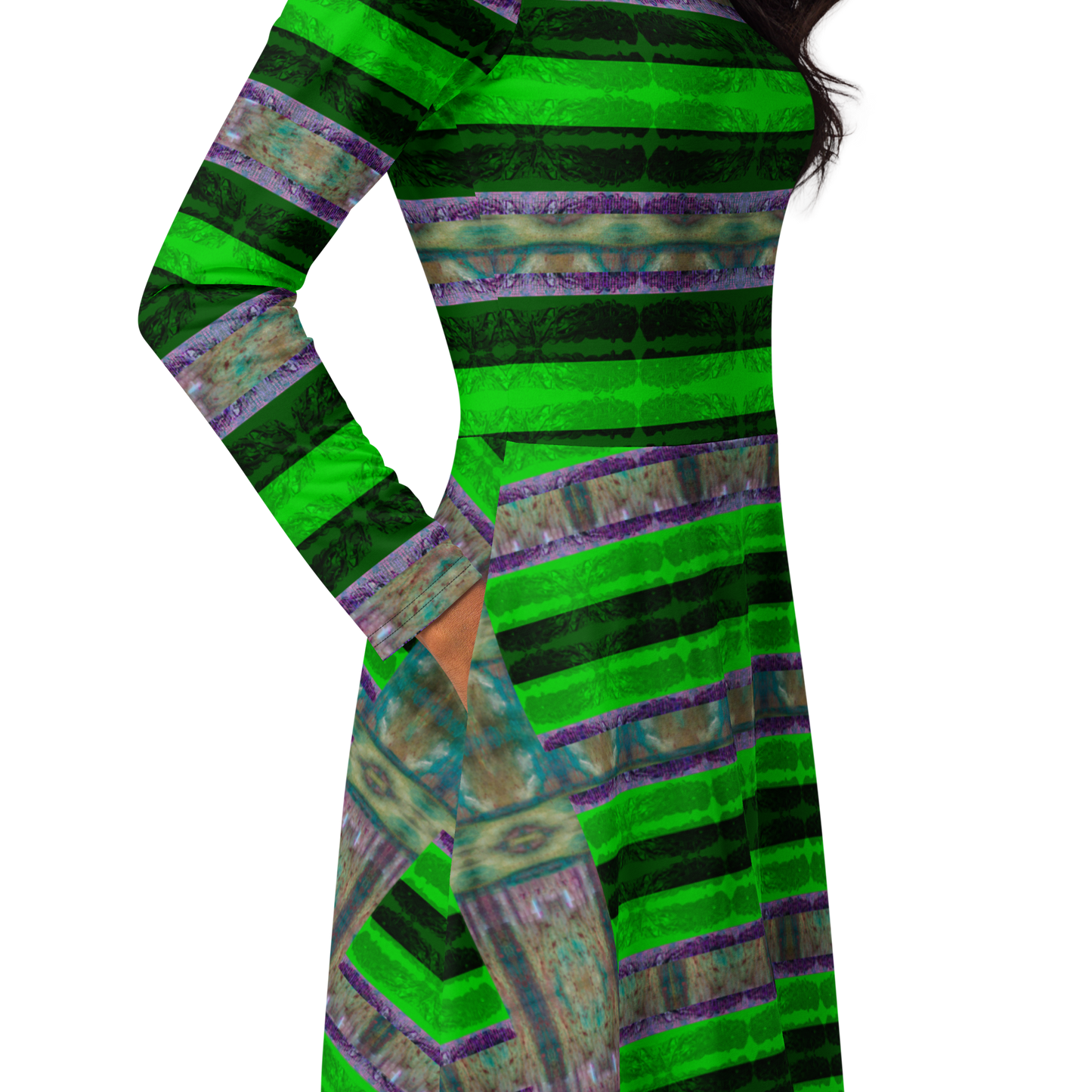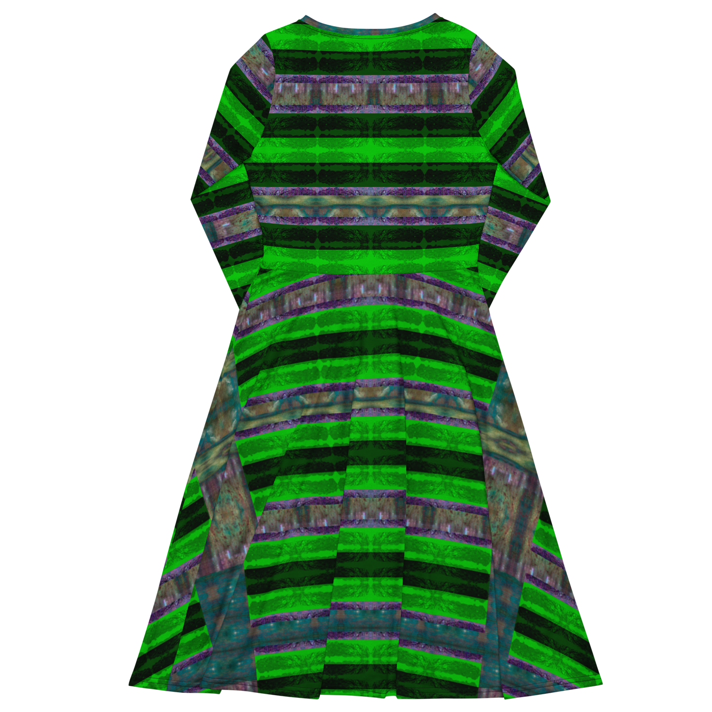 Meticulously crafted in premium knit mid-weight jersey, this midi-length dress offers timeless versatility. The fitted waist and flared bottom part create a flattering shape, while long sleeves and a classic boat neckline add sophistication. Side pockets give practicality, elevating the dress into an everyday essential that can shift effortlessly from casual to formal. Printed with exclusive artwork from River Jade Smith Travis Huffaker, each piece is unique—an investment in wearable art.