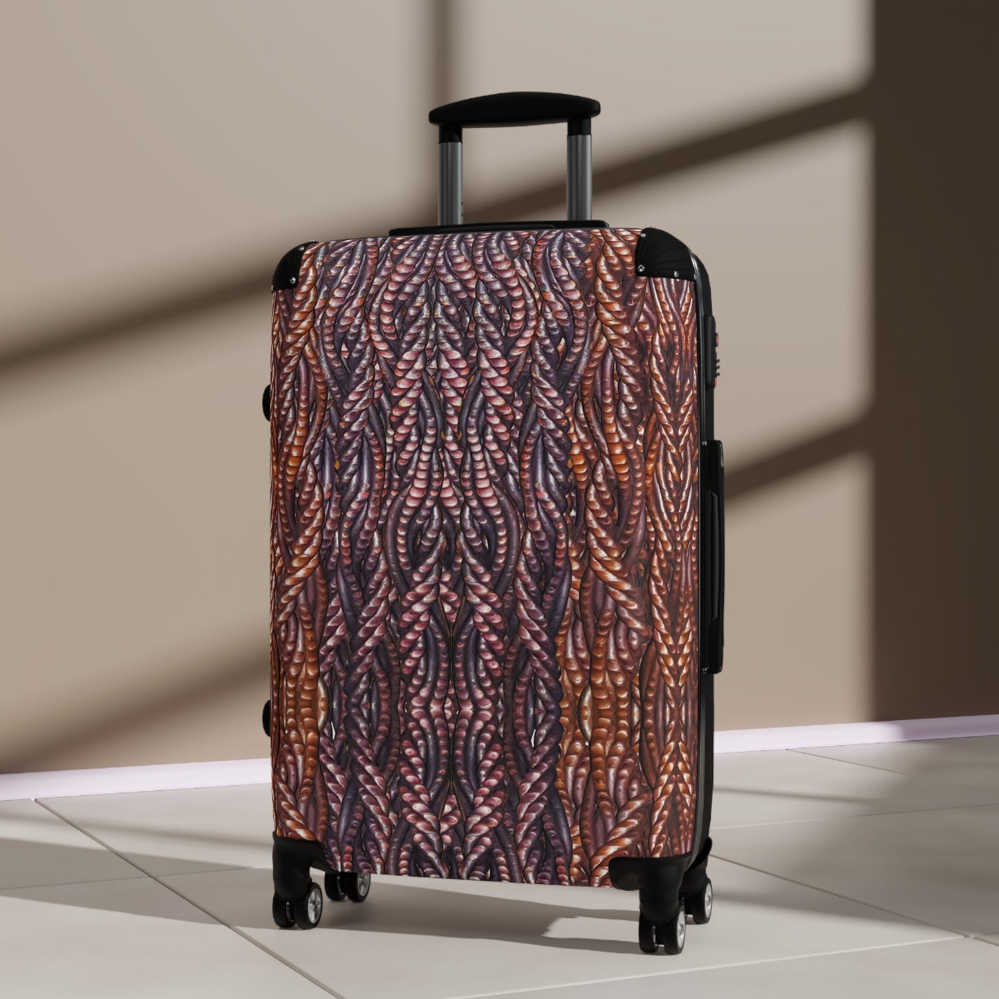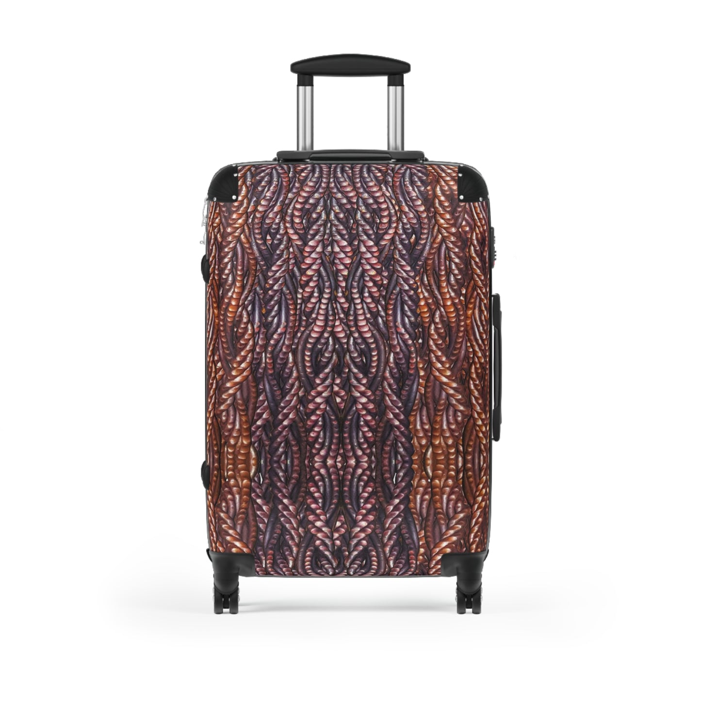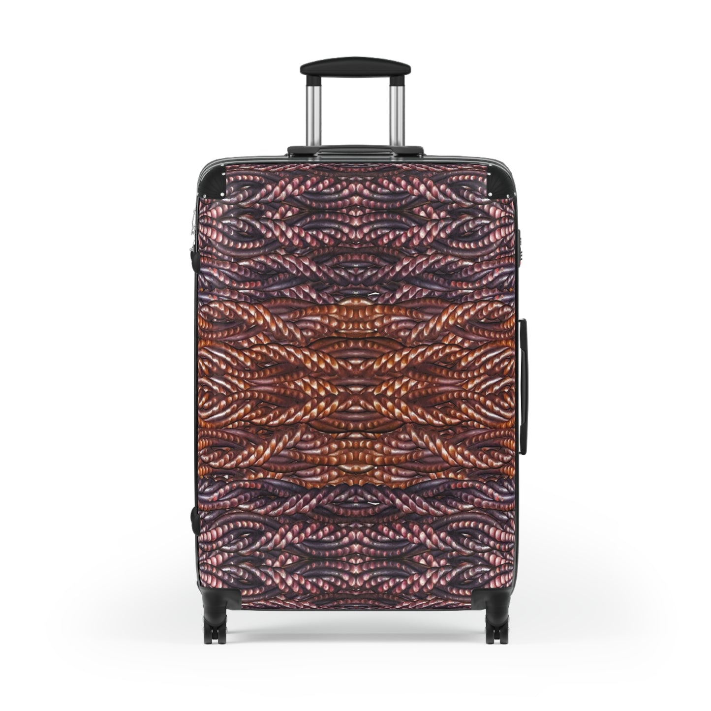 This Suitcase featuring original artwork by River Jade Smith Travis "Doby" Huffaker RJSTH, exclusively at River Jade Smithy RJS, offers a stylish and functional solution for travelers. With multiple sizes, an adjustable handle, and 360-degree swivel wheels, this suitcase makes navigating through airports and cities effortless. Its PC shell and 100% polycarbonate front provide durability and impact, scratch, and temperature resistance while the canvas surface allows for high-resolution designs. Inner pockets make organizing small items easy and the largest suitcase can extend its storage space. Plus, with a built-in lock and double wheels, your belongings will stay safe and transportation will be smooth.