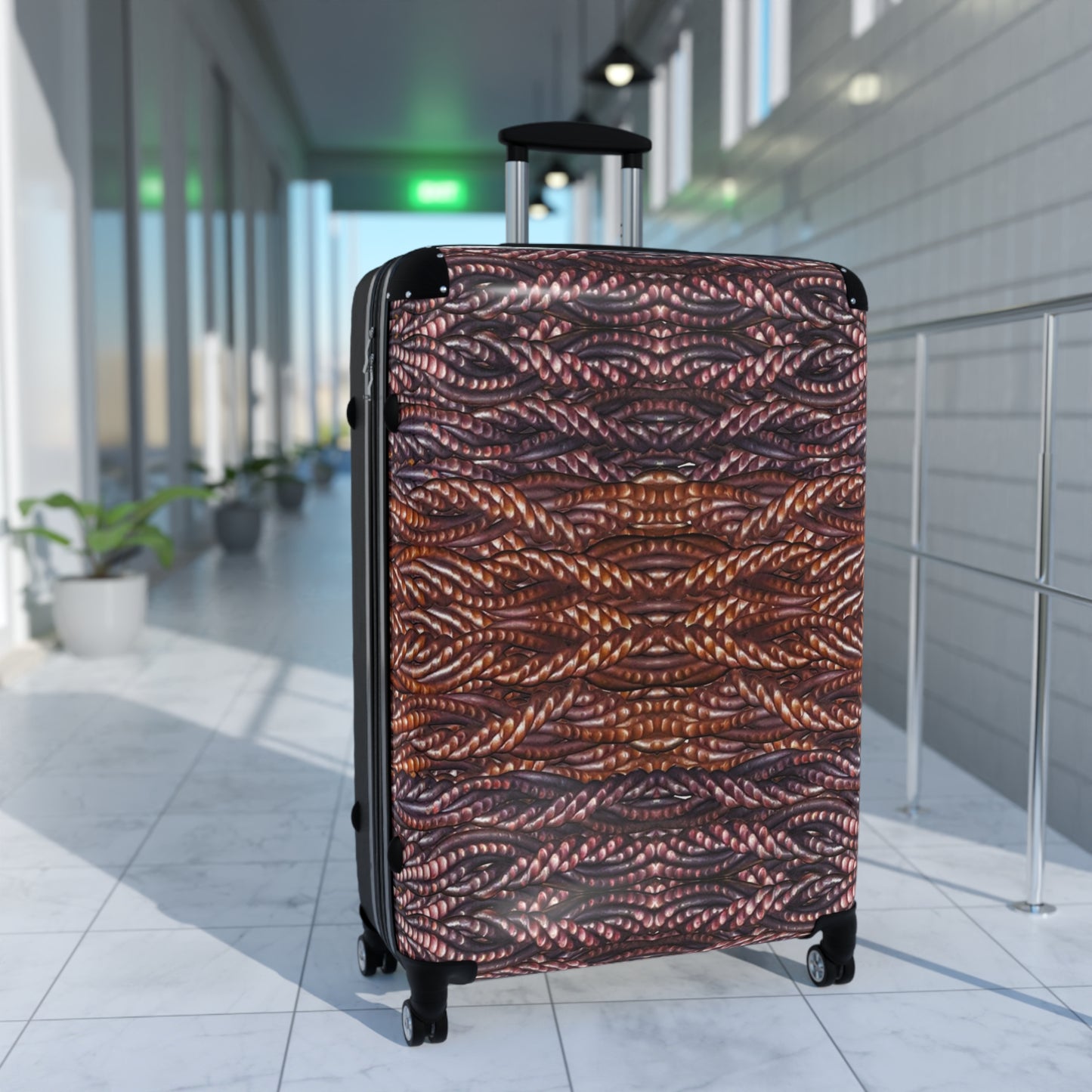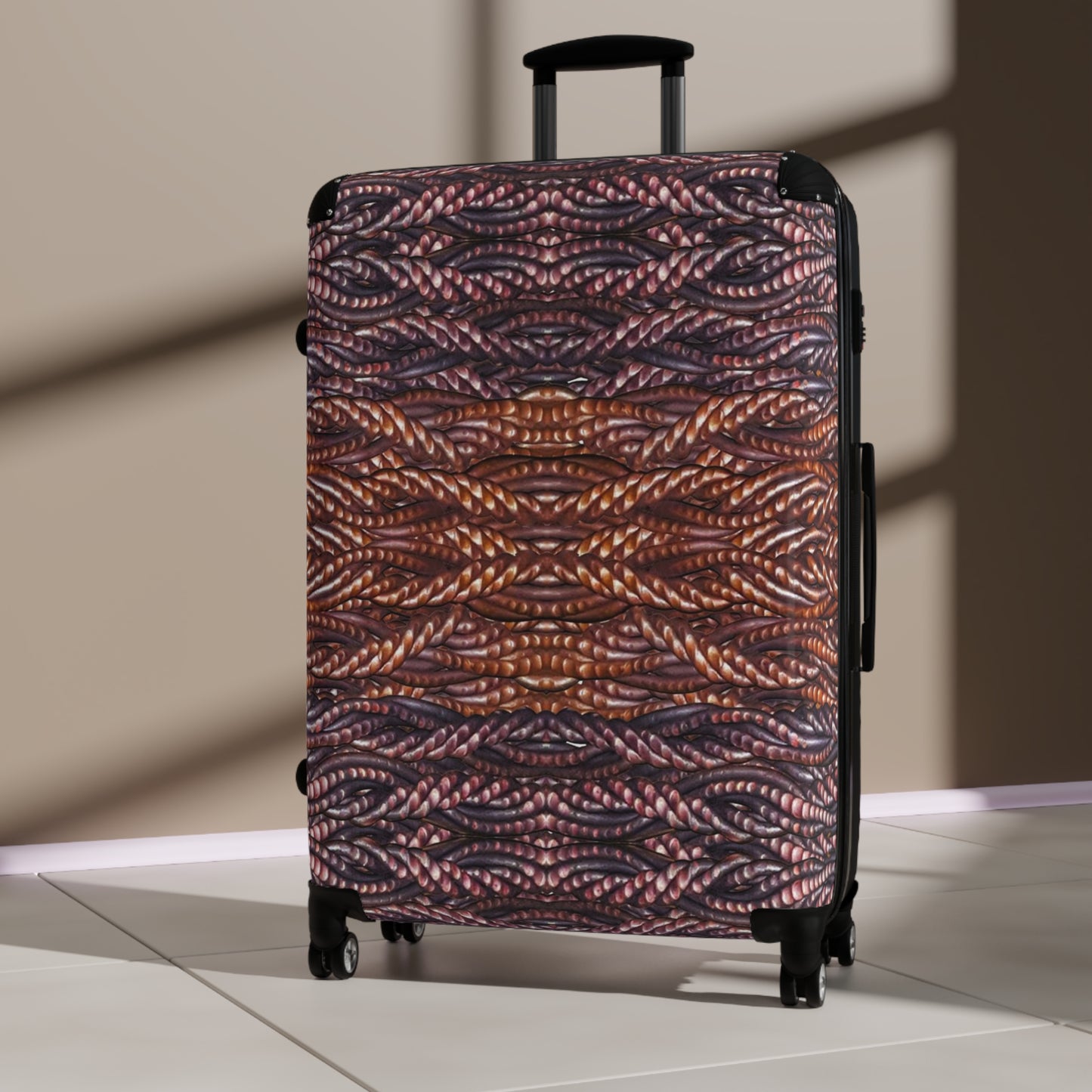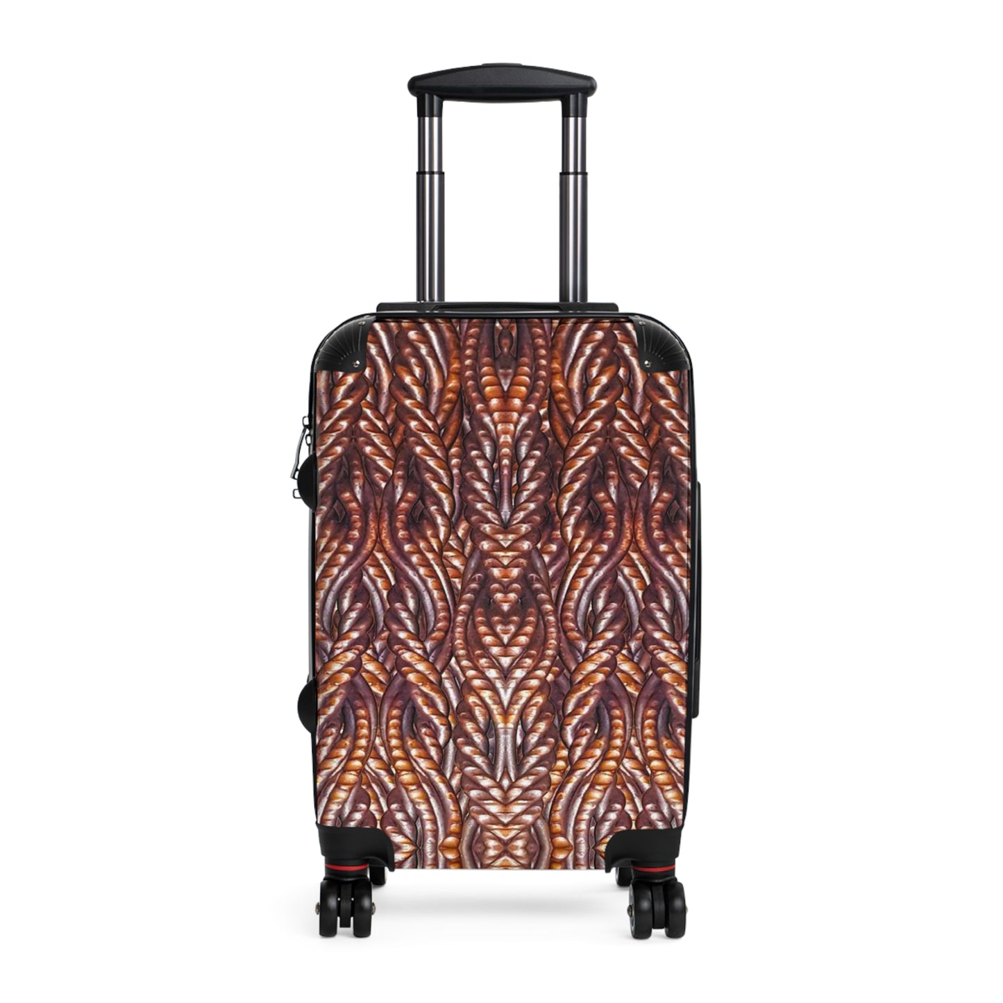 This Suitcase featuring original artwork by River Jade Smith Travis "Doby" Huffaker RJSTH, exclusively at River Jade Smithy RJS, offers a stylish and functional solution for travelers. With multiple sizes, an adjustable handle, and 360-degree swivel wheels, this suitcase makes navigating through airports and cities effortless. Its PC shell and 100% polycarbonate front provide durability and impact, scratch, and temperature resistance while the canvas surface allows for high-resolution designs. Inner pockets make organizing small items easy and the largest suitcase can extend its storage space. Plus, with a built-in lock and double wheels, your belongings will stay safe and transportation will be smooth.