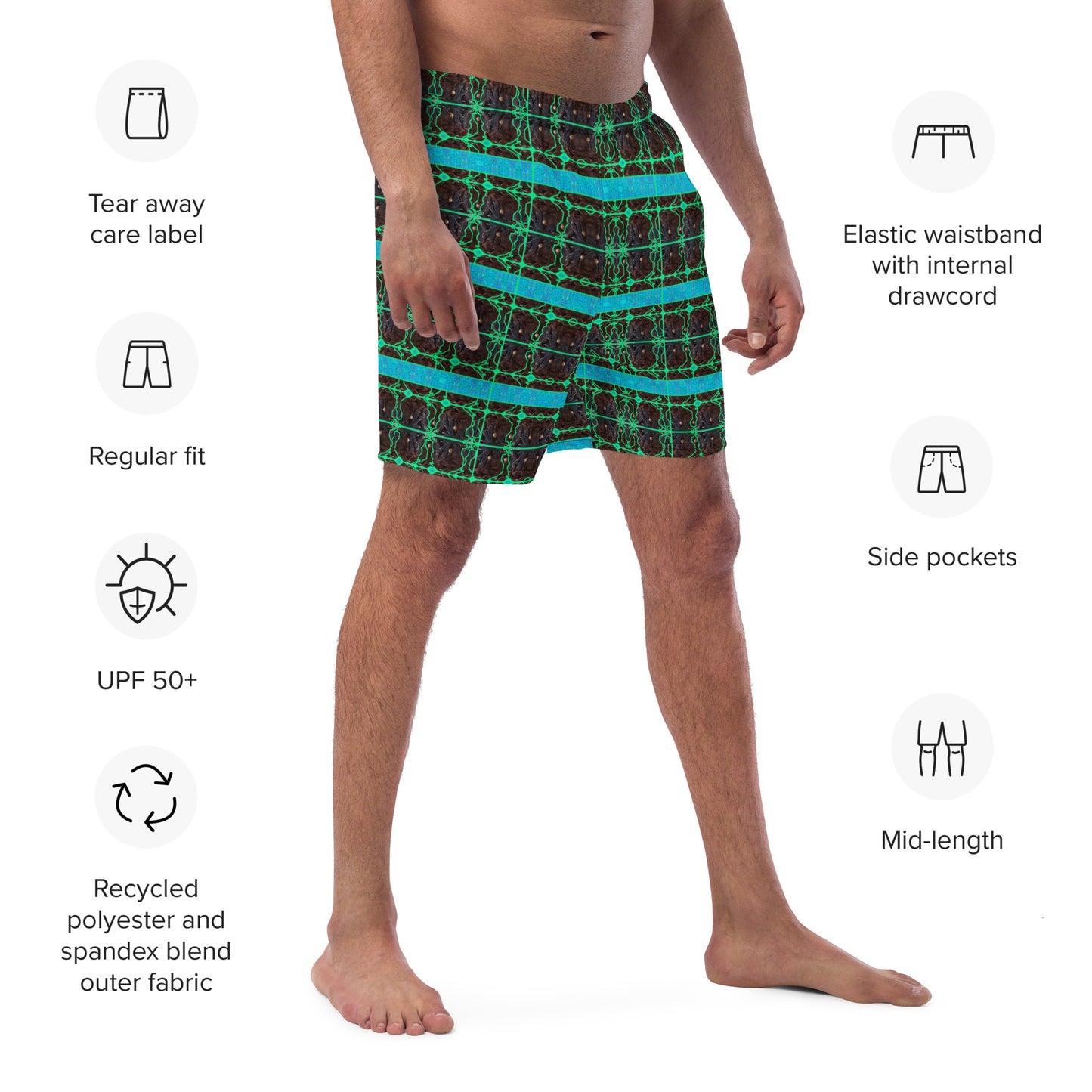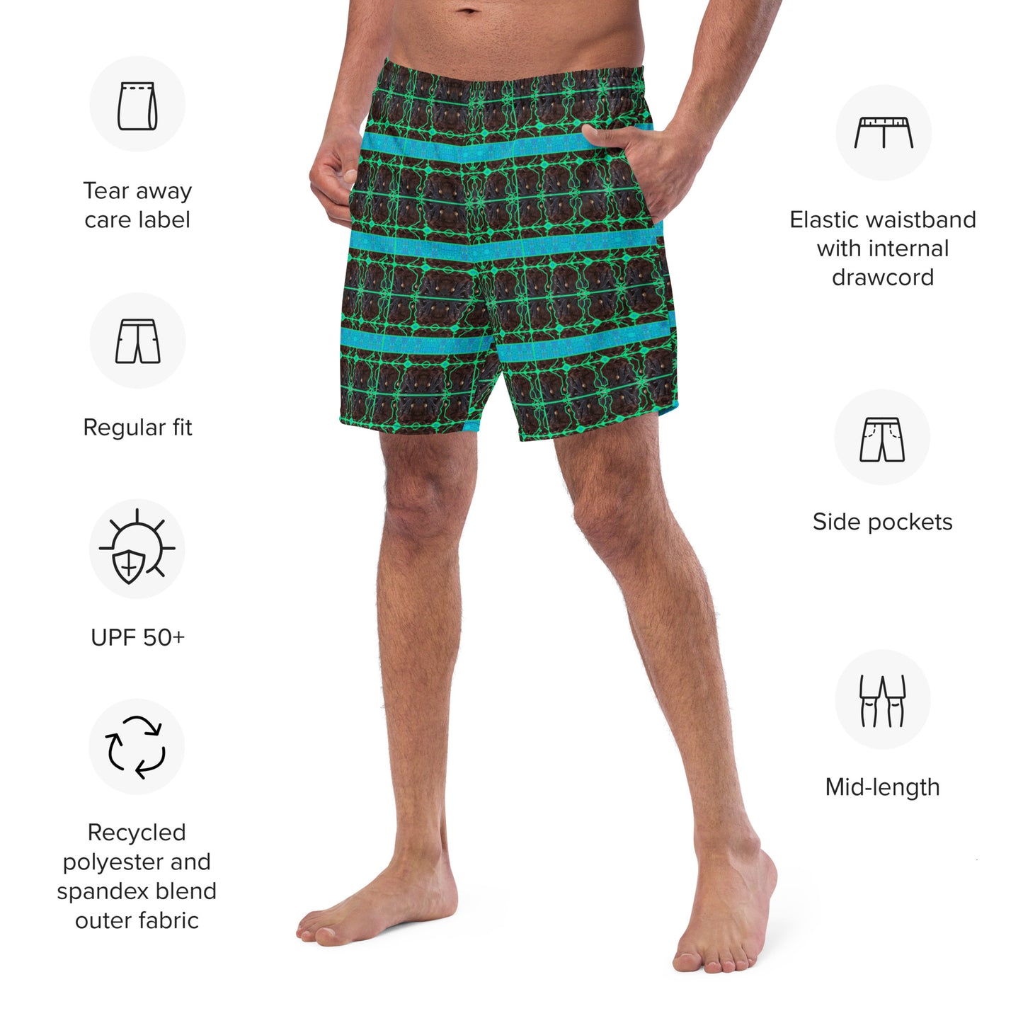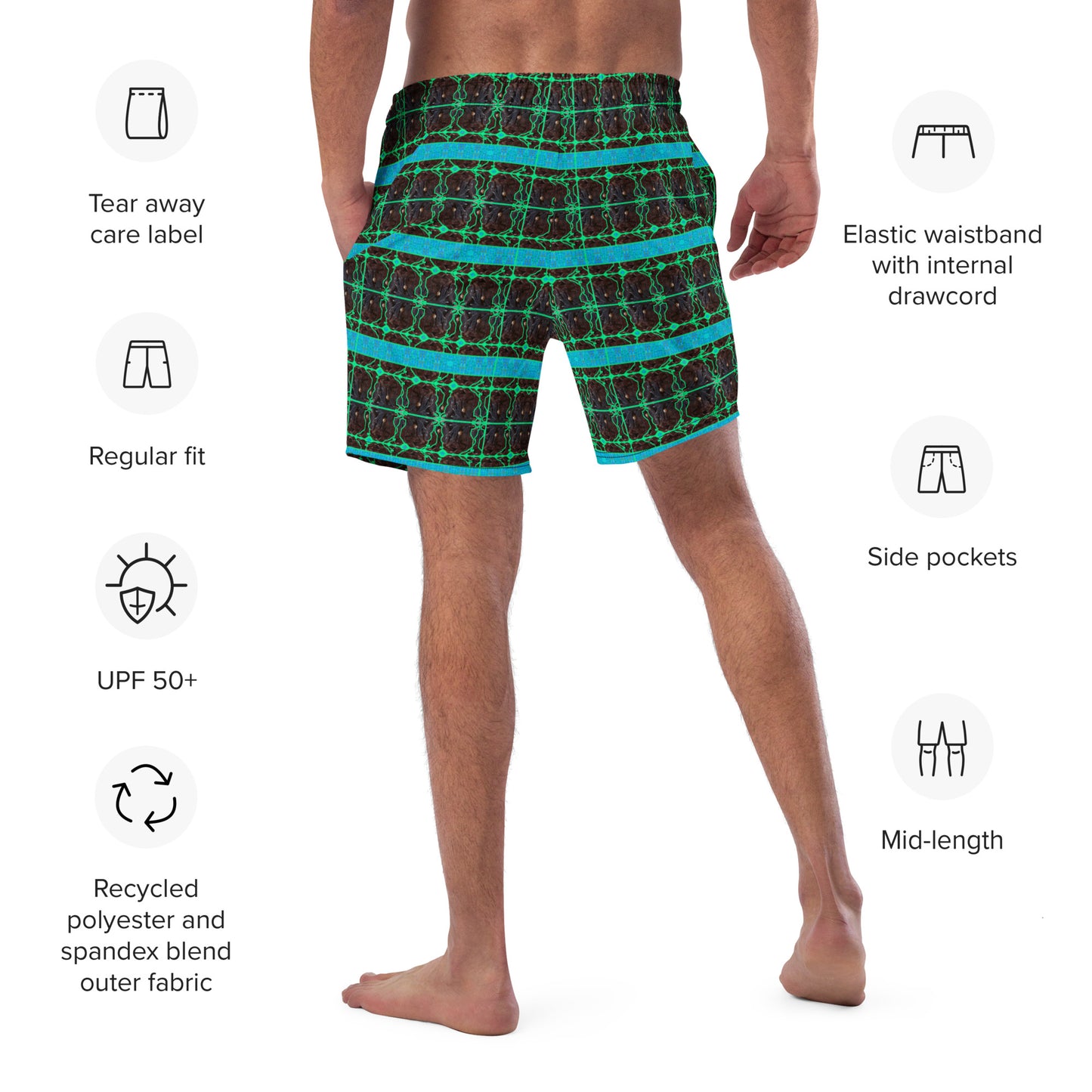 Sprinkle Flair with Sustainability: Each pair of Swim Trunks makes life a canvas for your creativity, designed for comfort, sustainability, and style. Embrace the journey towards a more eco-conscious wardrobe with River Jade Smithy and Printful.