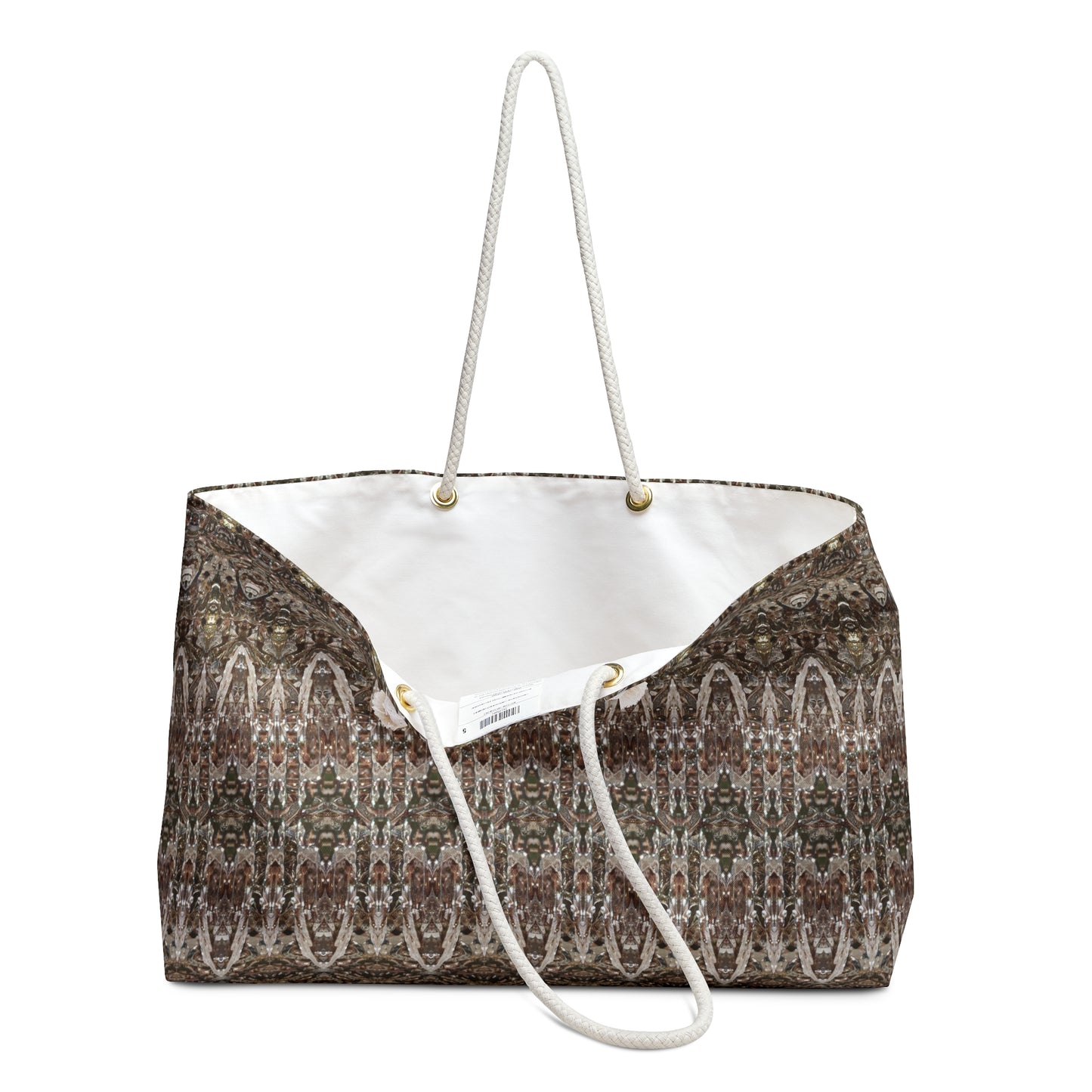 Description: Elegantly designed, the Weekender Bag is a fusion of practicality and artistic flair. Made from 100% spun polyester for durability and ease, it features a stylish T-bottom design and a cream sheeting interior lining. Sized at 24" x13", with a size tolerance of 0.75" (1.9 cm), it's the ideal companion for your weekend adventures. Assembled in the USA from globally sourced parts, it represents a global approach to local craftsmanship.